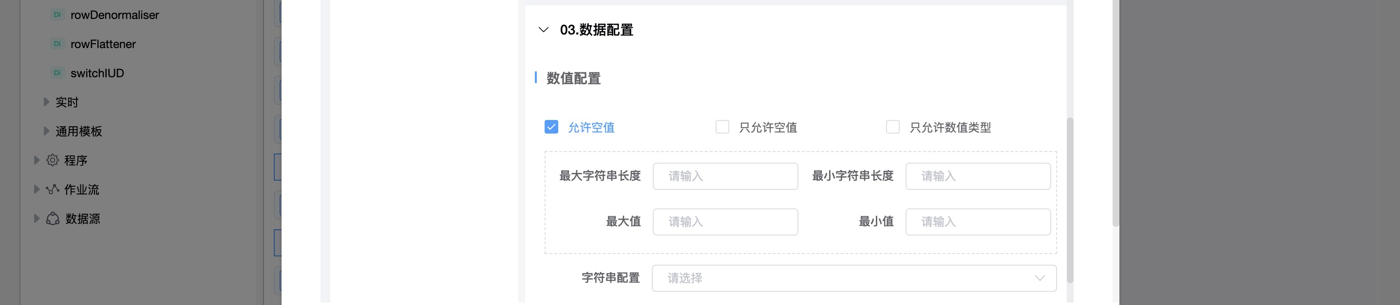 Data Validator步骤允许您定义简单的规则来描述字段中的数据应该是什么样子。这可以是一个值范围、一个不同的值列表或数据长度。