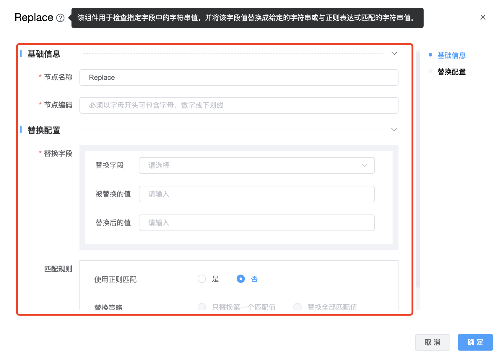 | 替换第一个匹配值 | 是否替换第一个匹配字符串。 仅当使用正则匹配 = true 时使用。 (可选项:true、false,默认fale) |