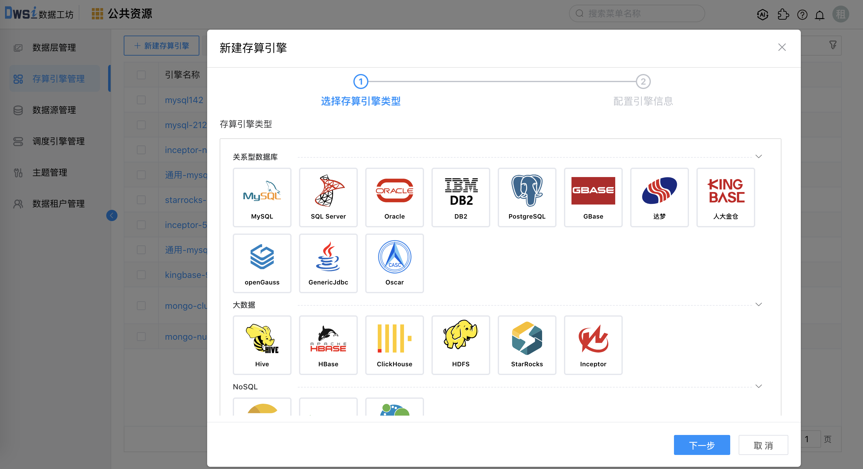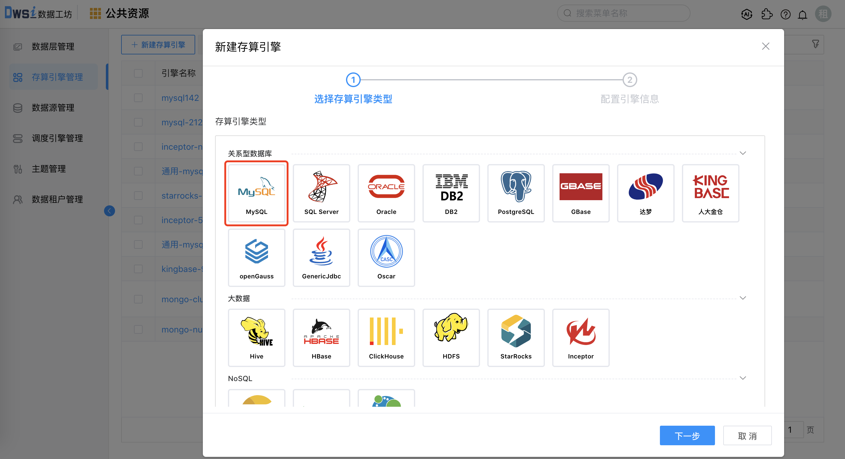 2. 以创建MySQL类型引擎为例,点击关系型数据库分类下的MySQL图标,点击下一步,如下图。