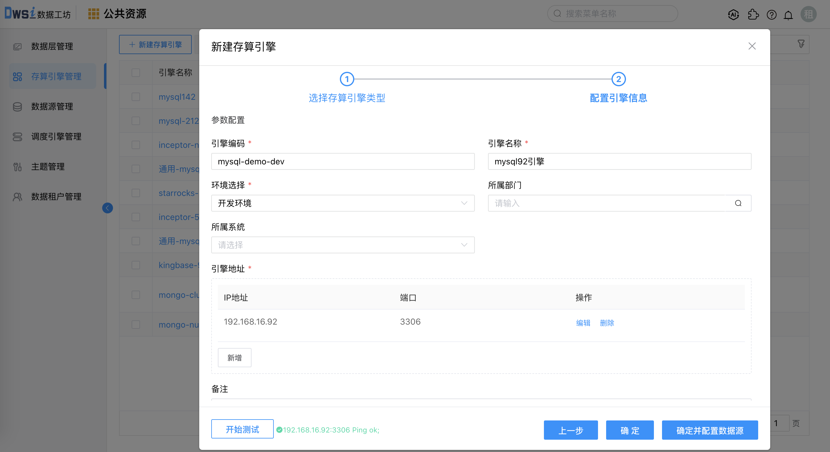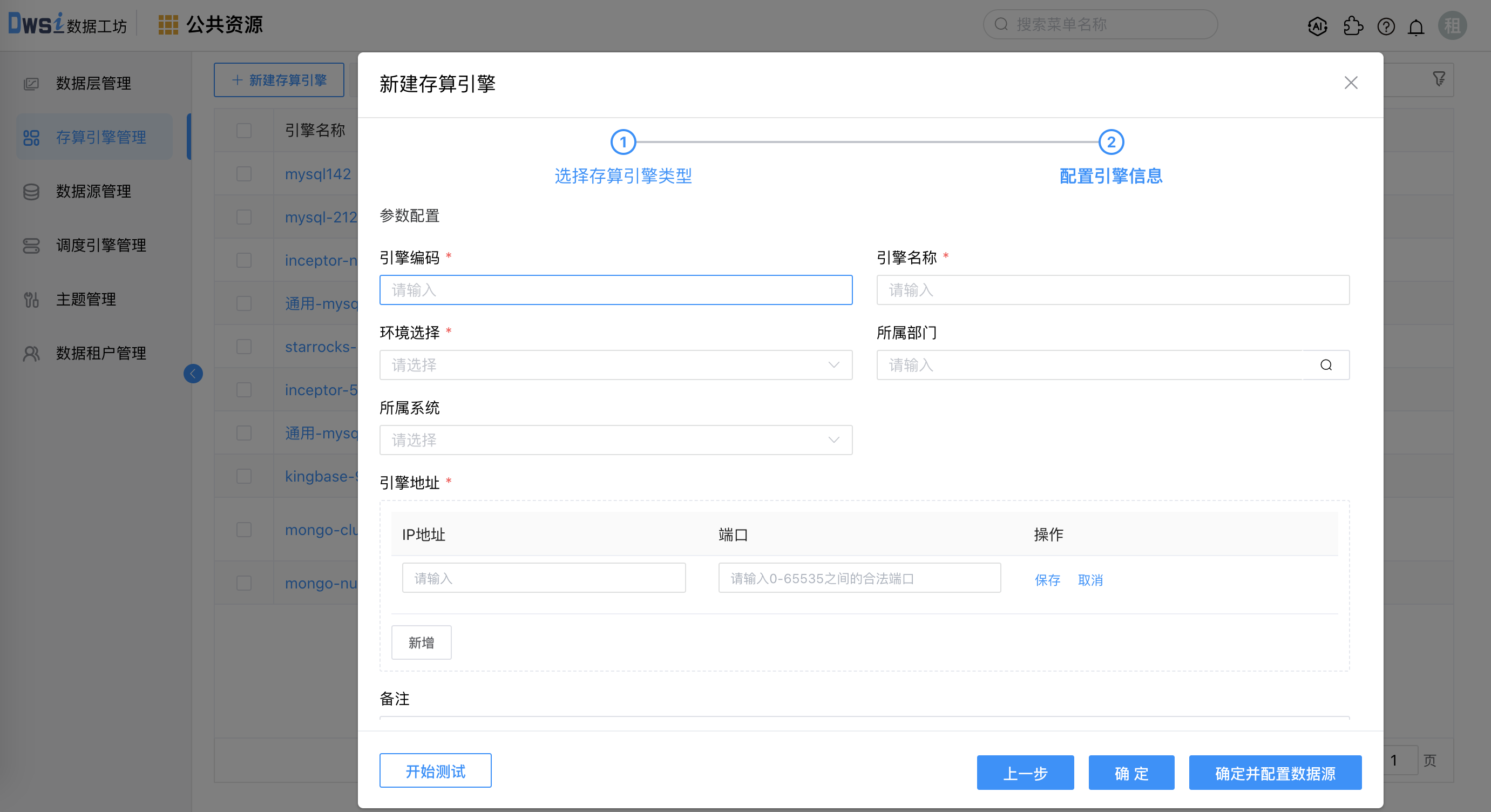 3. 输入必填项:引擎编码、引擎名称、环境选择、引擎地址及引擎端口,点击开始测试按钮,测试成功后点击确定按钮保存引擎数据。