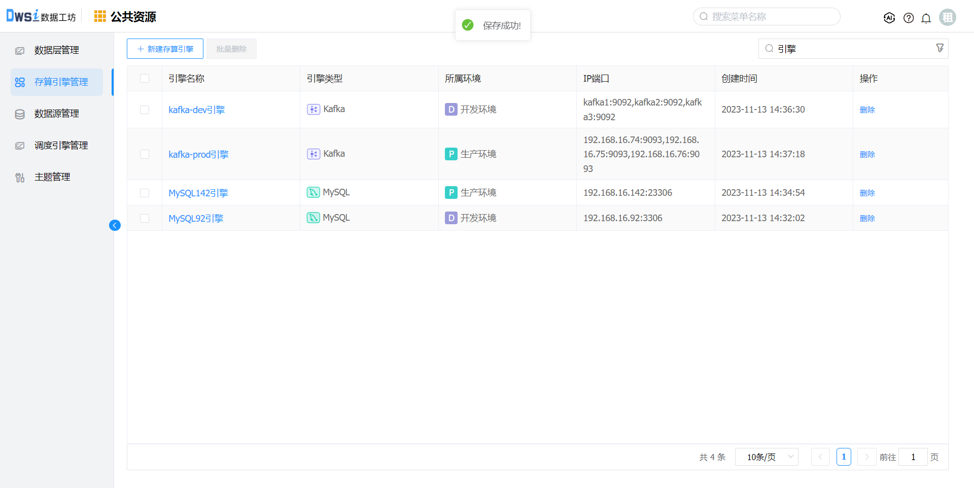 1. 点击上方菜单栏“公共资源”,进入公共资源管理界面,点击菜单栏的"存算引擎管理",进入存算引擎管理界面。在【存算引擎管理】页面,点击"新建存算引擎"按钮。