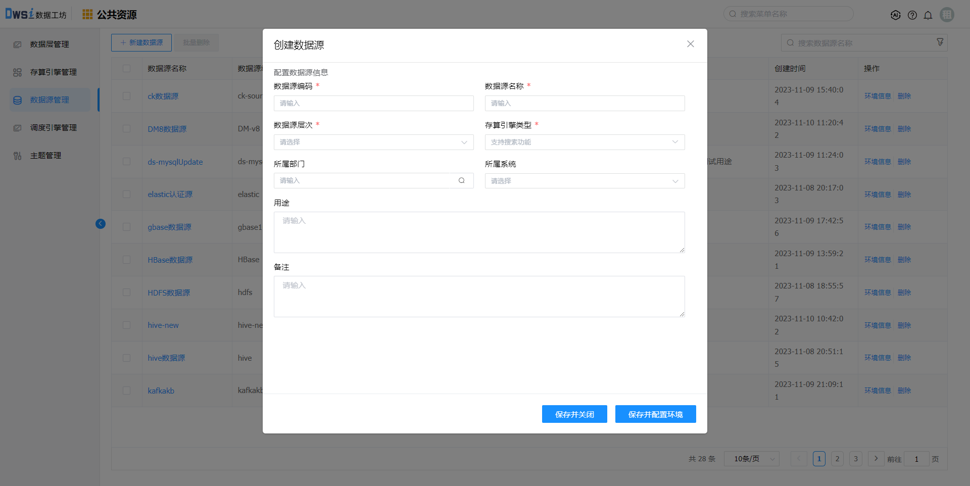 2. 输入数据源编码、数据源名称,选择数据源层次,输入其他非必填项(可选),点击"保存并配置环境"。