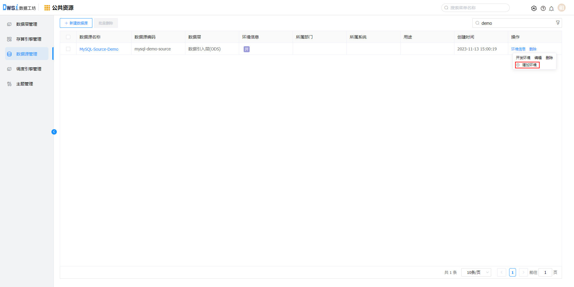 1. 点击上方菜单栏“公共资源”,进入公共资源管理界面,点击菜单栏的"数据源管理",进入数据源管理界面。在【数据源管理】页面,点击"新建数据源"按钮。