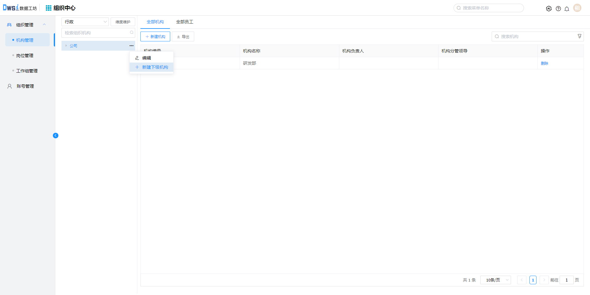 1. 点击上方菜单栏“组织中心”,再点击【组织管理】-【机构管理】菜单,在公司下点击【新建下级机构】