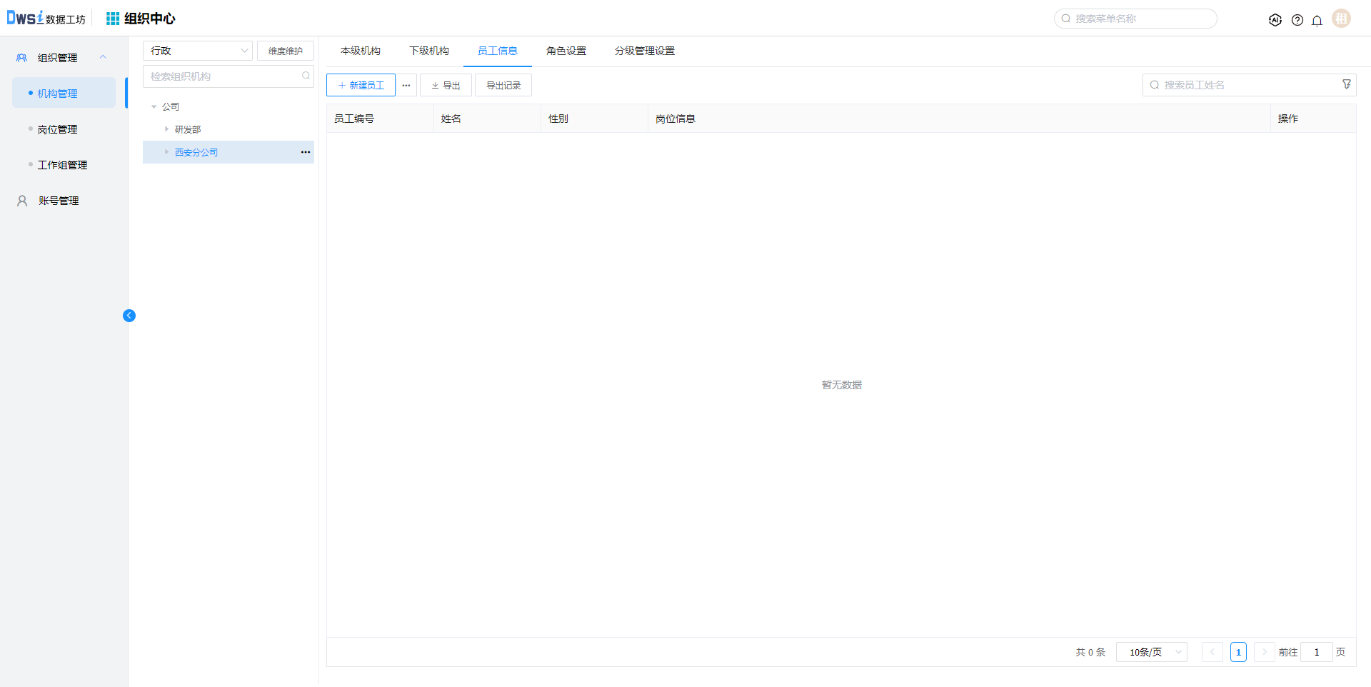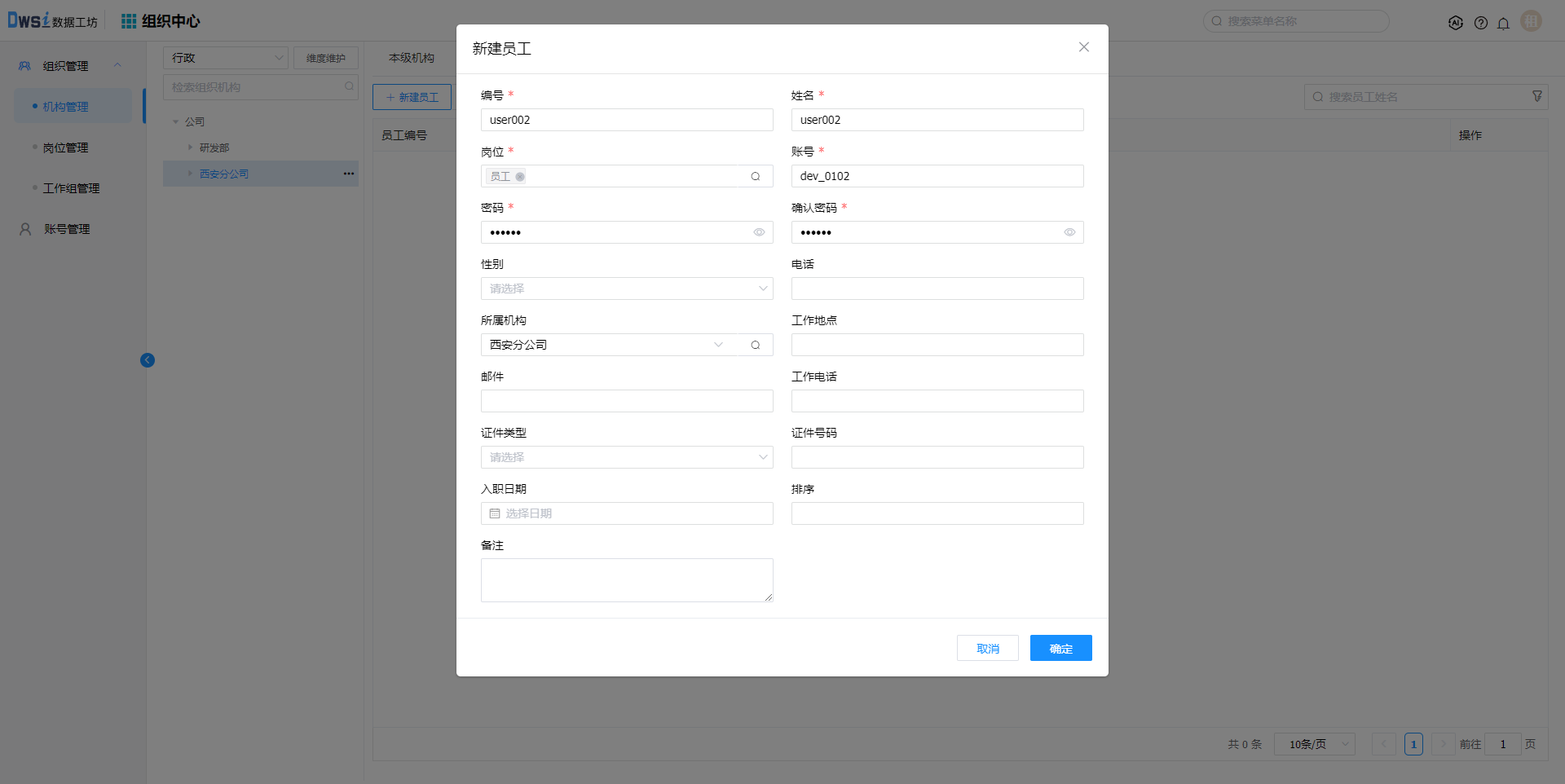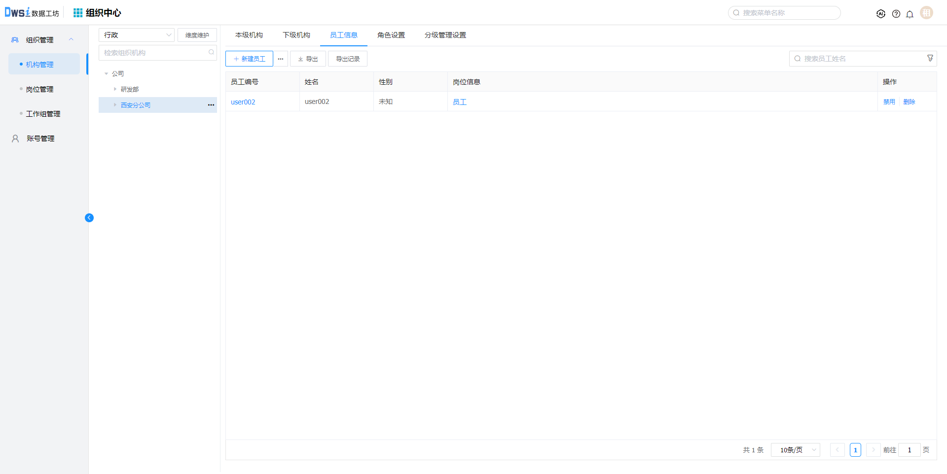 3. 在新建的机构下, 点击【新建员工】,输入必填项后保存,员工及对应账号创建成功。