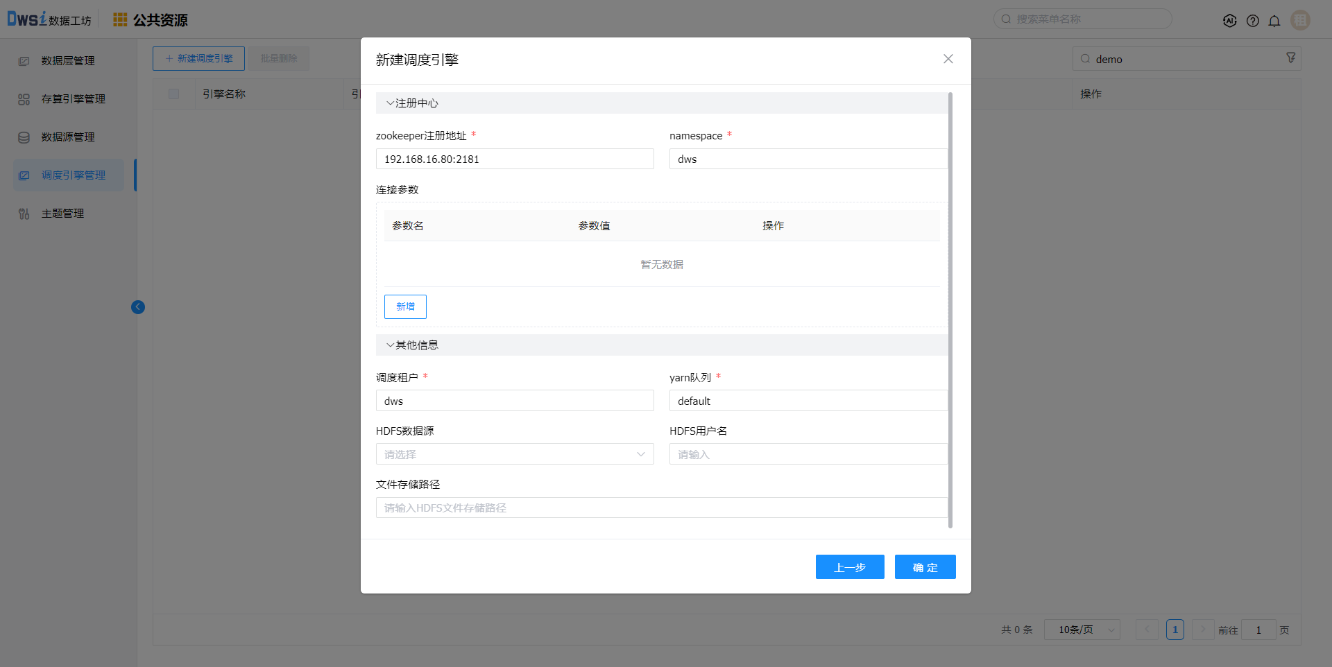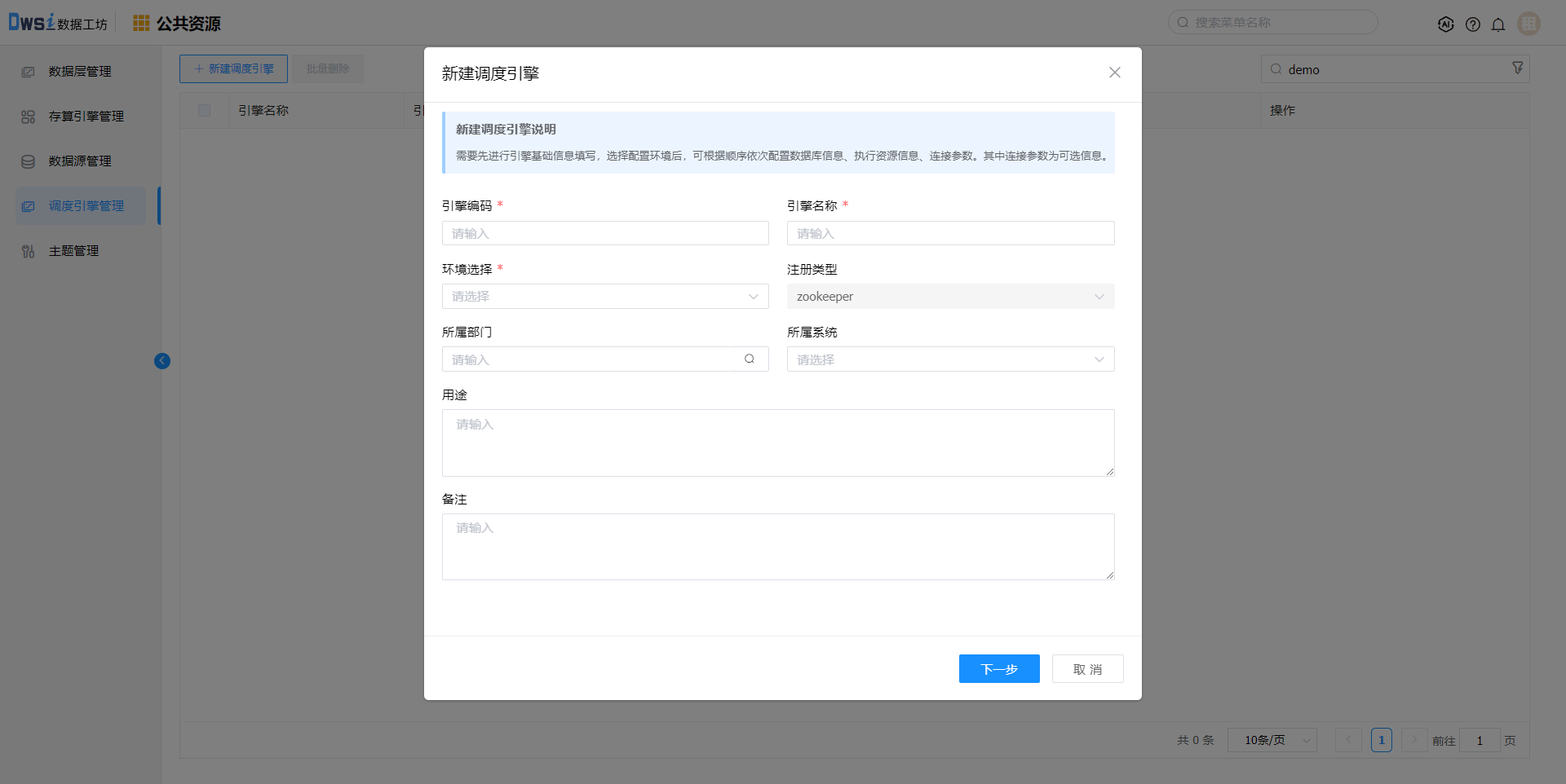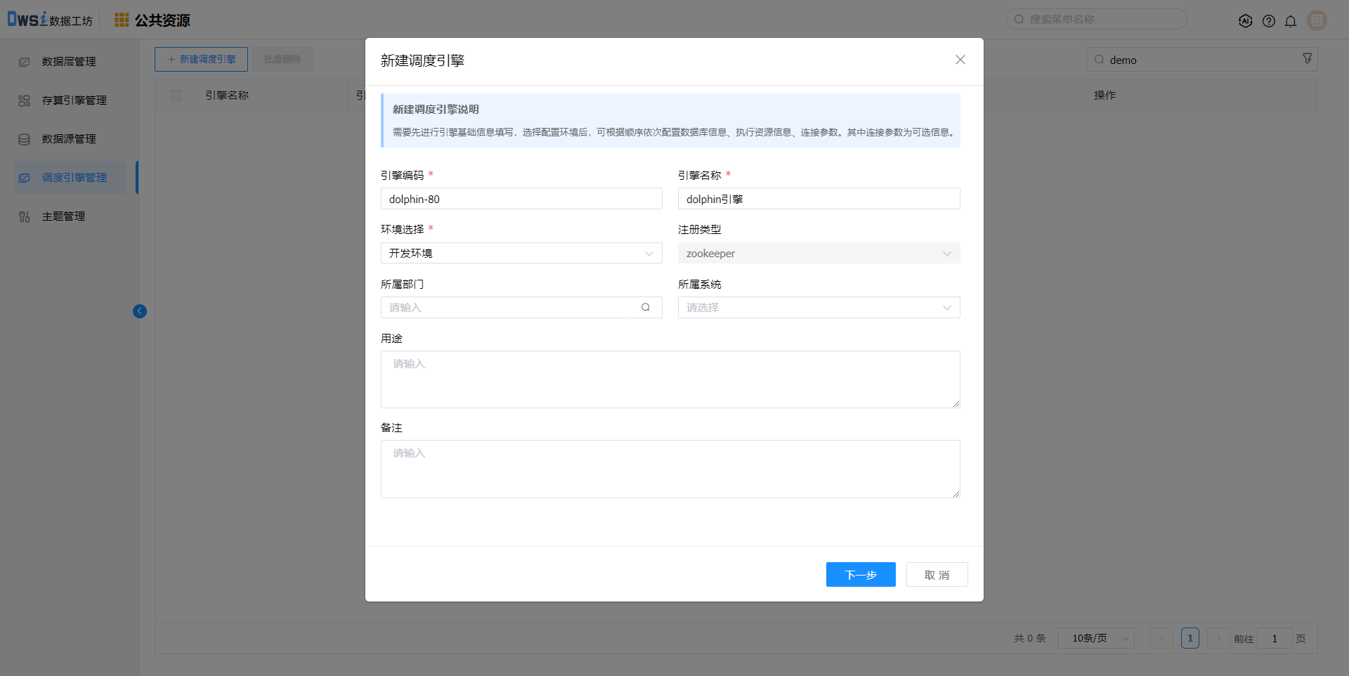 2. 输入引擎名称、引擎编码、选择环境:开发环境,点击下一步。