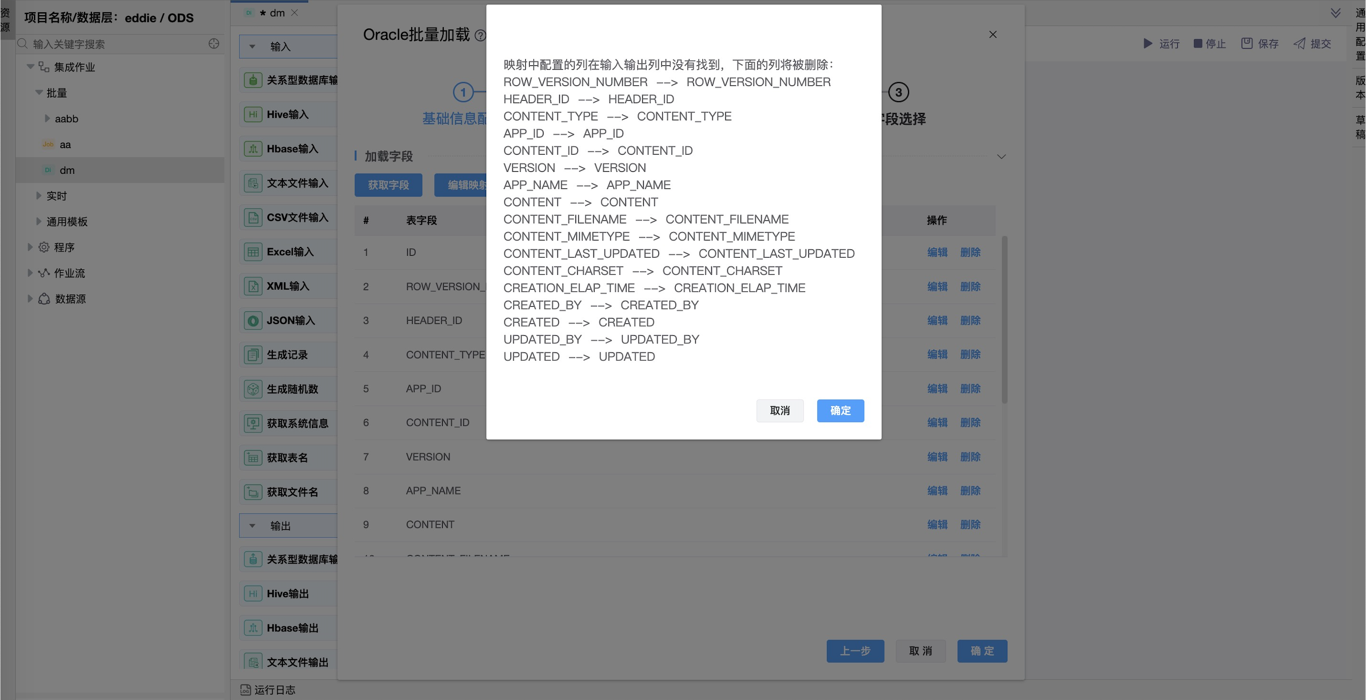 | 加载字段 | 这个表包含了加载数据的字段列表,属性包括: 表字段:要在Oracle表中加载的表字段; 流字段:从传入行中获取的字段; 日期编码: “日期”或“日期掩码”决定如何在Oracle中加载日期/时间戳。当留空时,对于日期,默认为“Date”。“Date”类型将值截断为月几,而DateTime选项传递日期和时间信息。 |