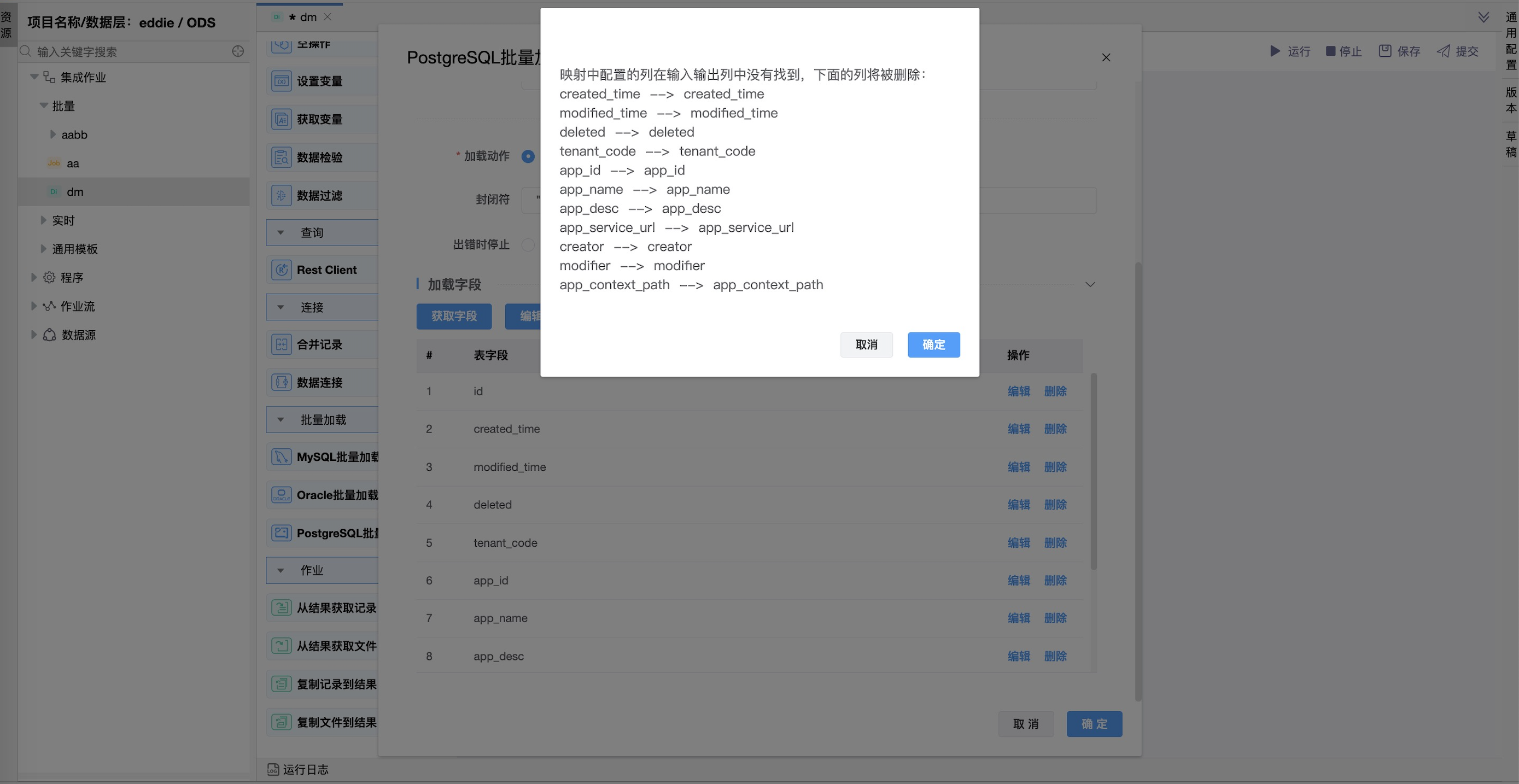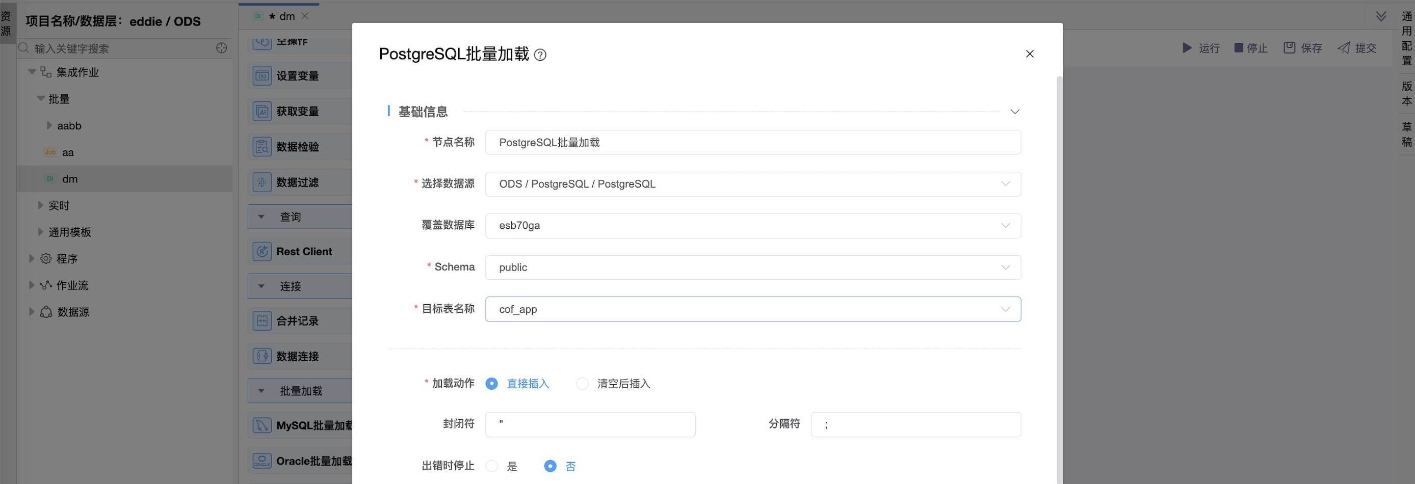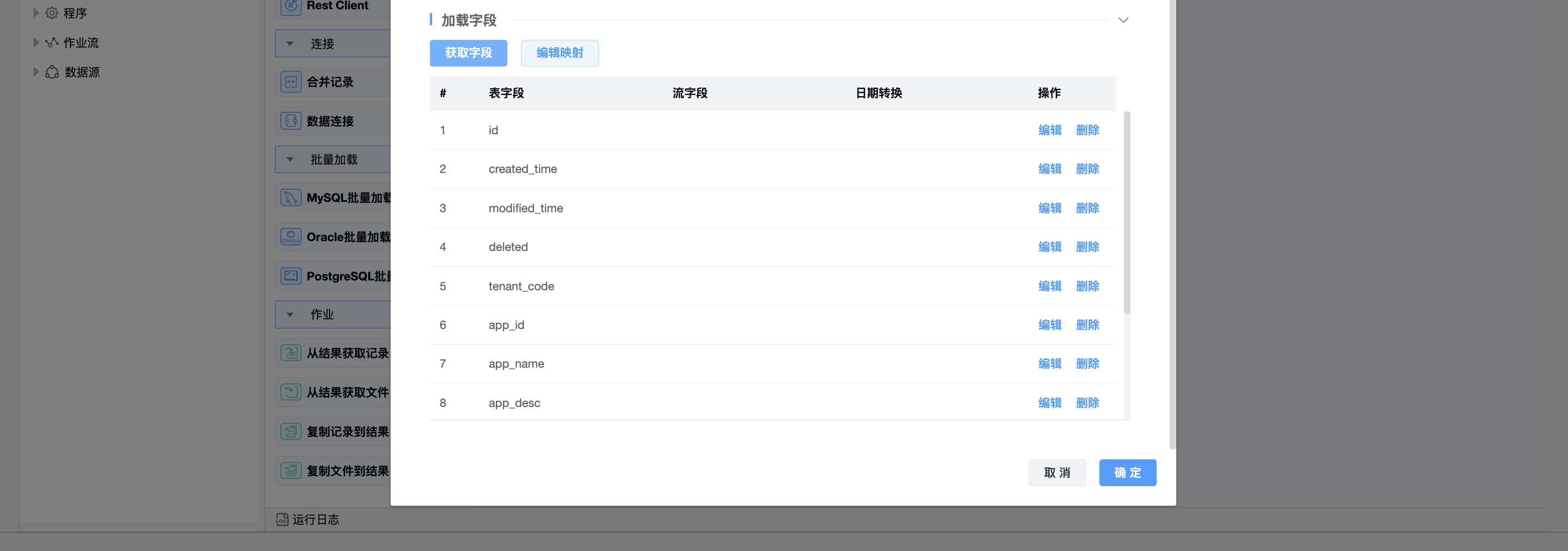 | 加载字段 | 这个表包含了加载数据的字段列表,属性包括: 表字段:PostgreSQL表中要加载的表字段; 流字段:从传入行中获取的字段; 日期编码: “日期”或“日期掩码”决定如何在PostgreSQLe中加载日期/时间戳。当留空时,对于日期,默认为“Date”。“Date”类型将值截断为月几,而DateTime选项传递日期和时间信息。 |