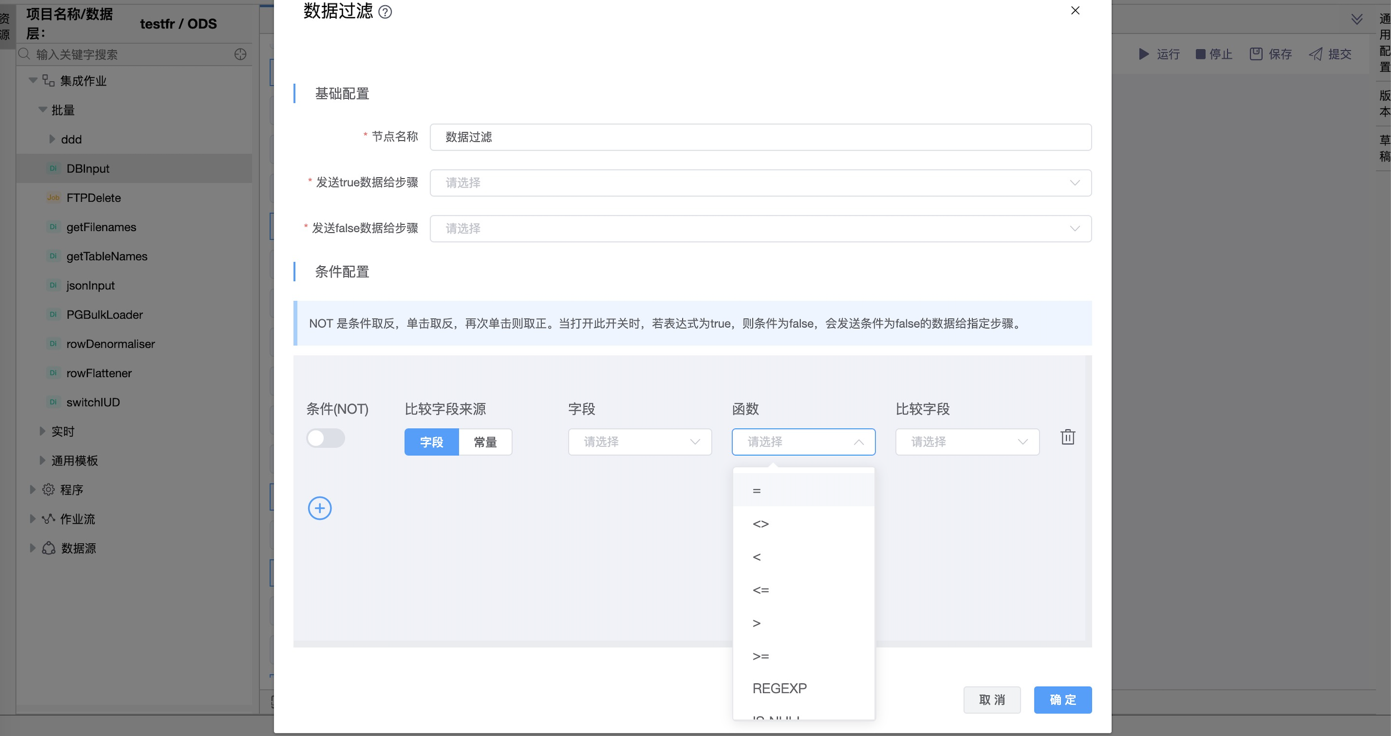 功能介绍:该组件用于根据条件和比较进行筛选数据行,让数据流从一路到两路。一旦此步骤连接到前一个步骤(一个或多个接收输入),您可以单击《条件配置》中的“字段”、“函数”和“比较字段”区域来构造条件。