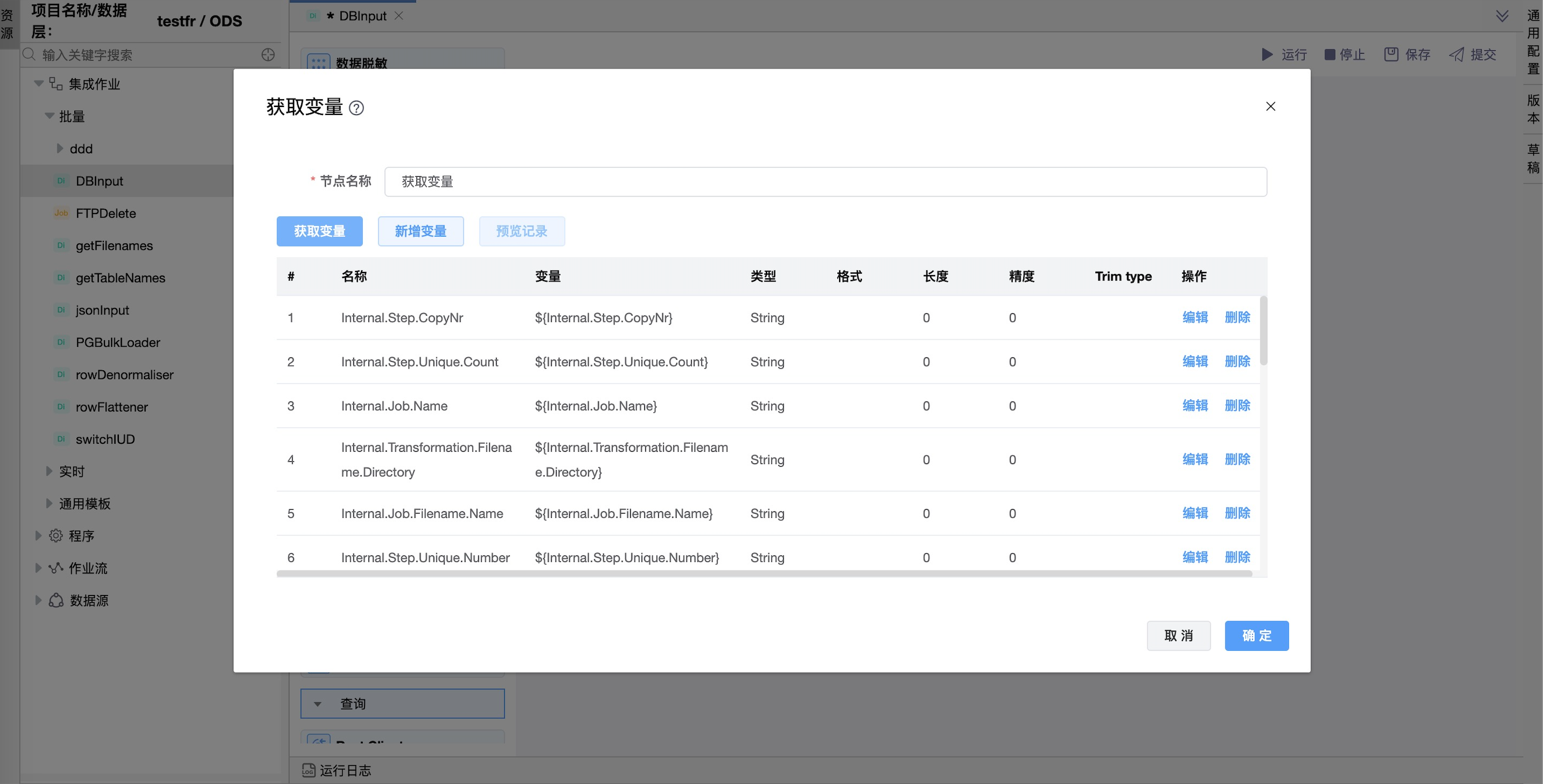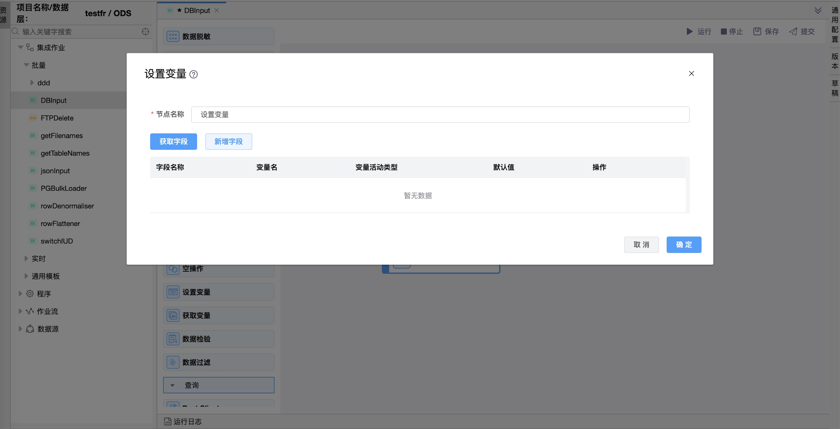 功能介绍:该组件用于设置环境变量,范围可以是:JVM变量、作业变量、父作业变量、根作业变量。使用时通过${var}或 %%var%%变量方式引用变量。该组件能够将传递进来的字段数据转变成模型变量,进行对变量的调用操作。