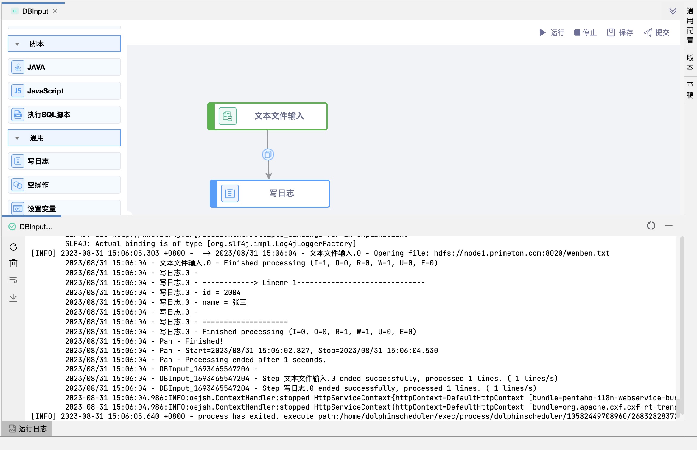 功能介绍:该组件将信息写入PDI日志系统。一般将kettle 转换开发完成,都是通过定时任务来调度作业运行。从而实现自动化同步数据,但是在数据运行过程中总有偶尔突发情况,如因网络、字段长度不够导致数据异常等。此时最好追溯问题的办法就是查看日志。