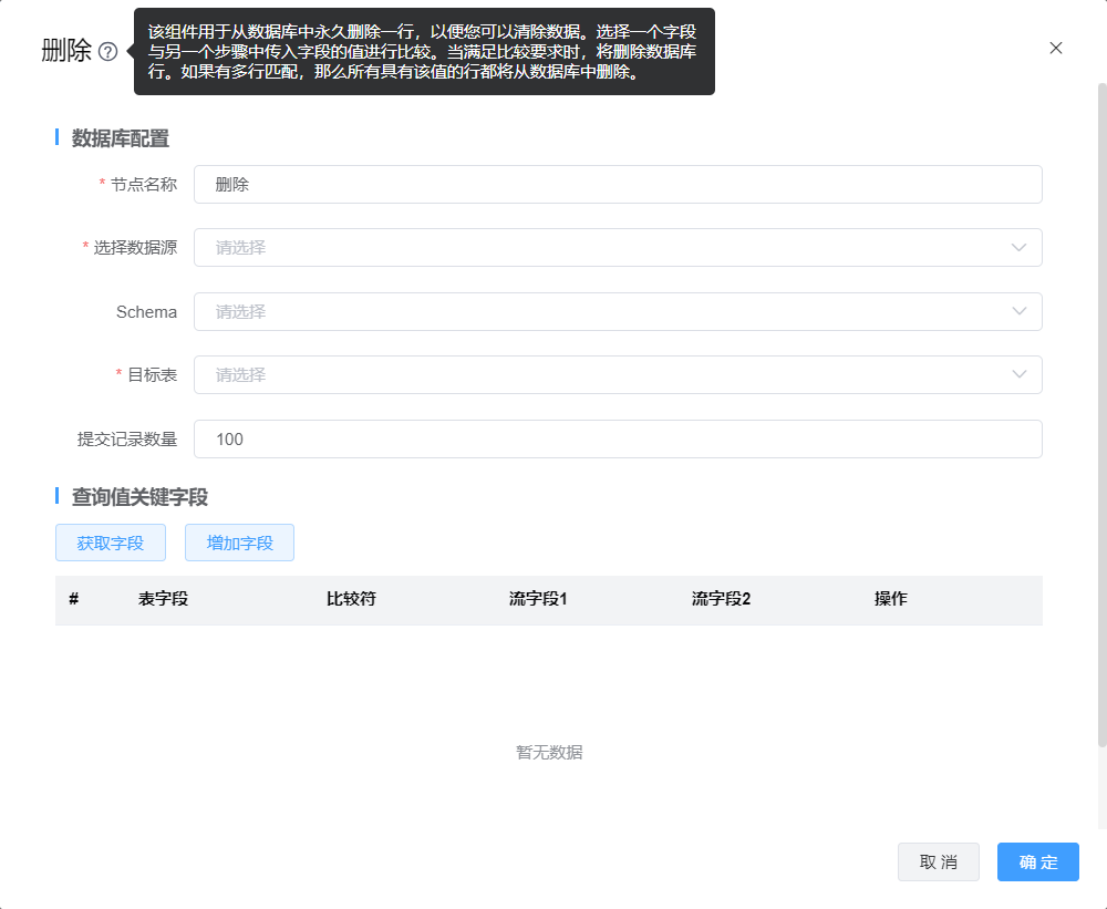 功能介绍:删除用于从数据库中永久删除一行,以便您可以清除数据。选择一个字段与另一个步骤中传入字段的值进行比较。当满足比较要求时,将删除数据库行。如果有多行匹配,那么所有具有该值的行都将从数据库中删除