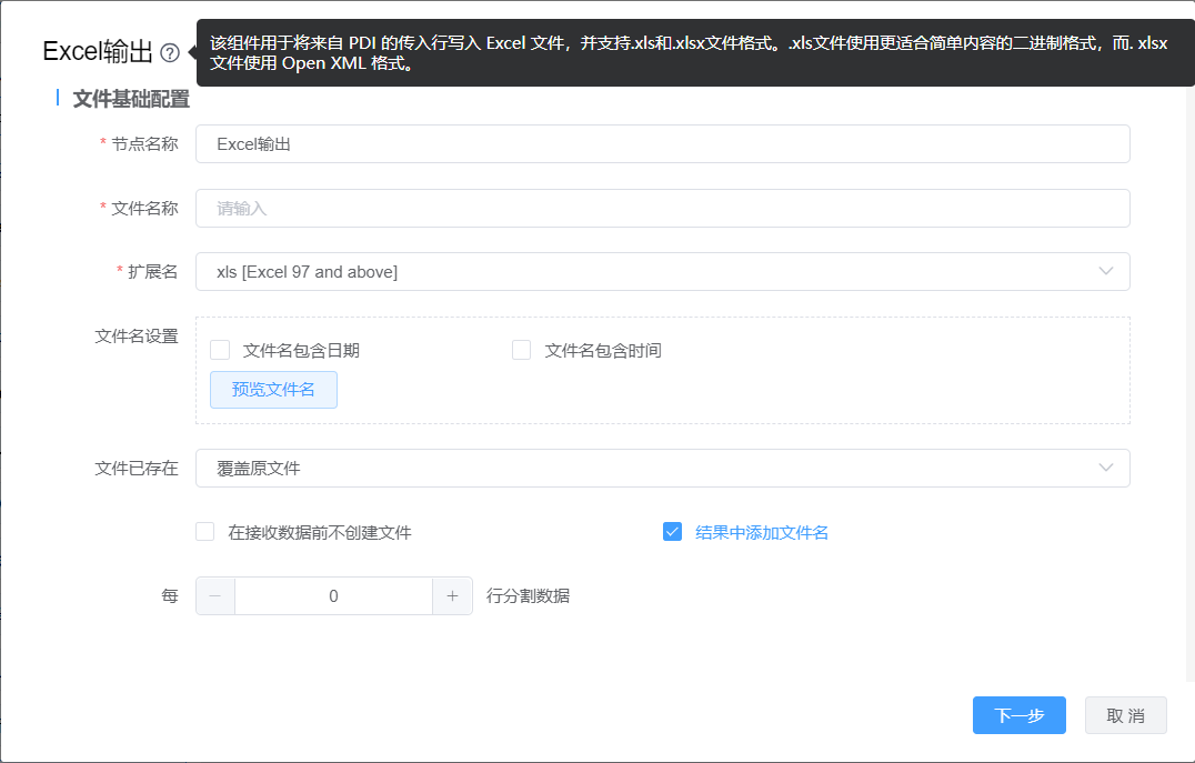 功能介绍:Excel输出用于将来自 PDI 的传入行写入 Excel 文件,并支持.xls和.xlsx文件格式。.xls文件使用更适合简单内容的二进制格式,而. xlsx文件使用 Open XML 格式。