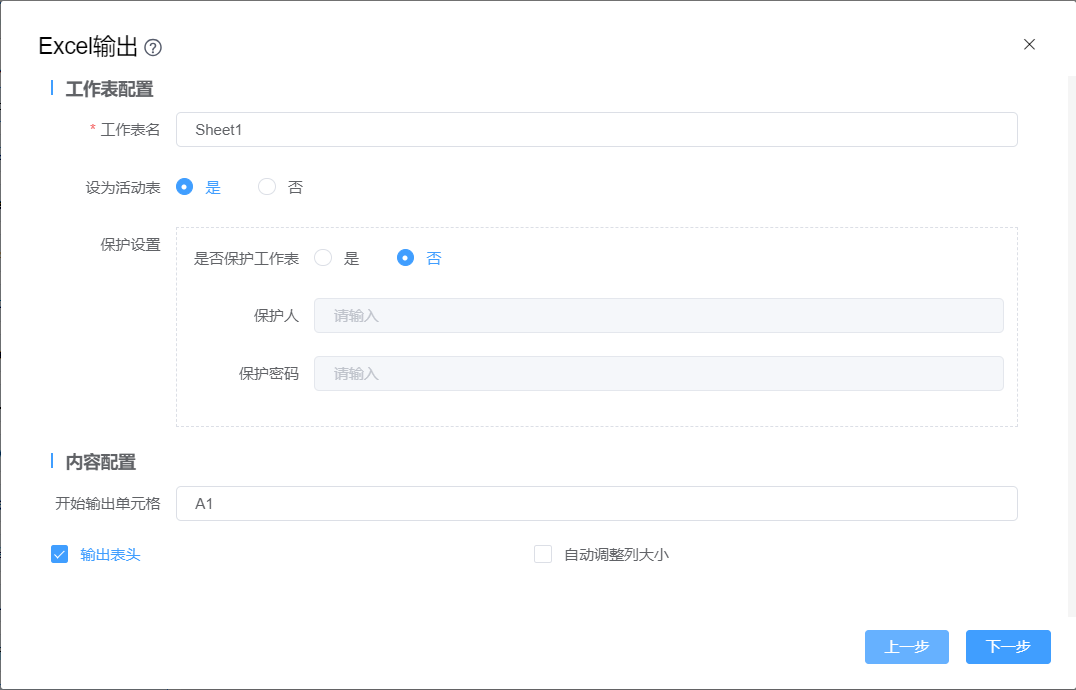 | 保护设置 | 勾选此项,使用密码保护工作表,必须在“保护密码”字段中指定密码 |
