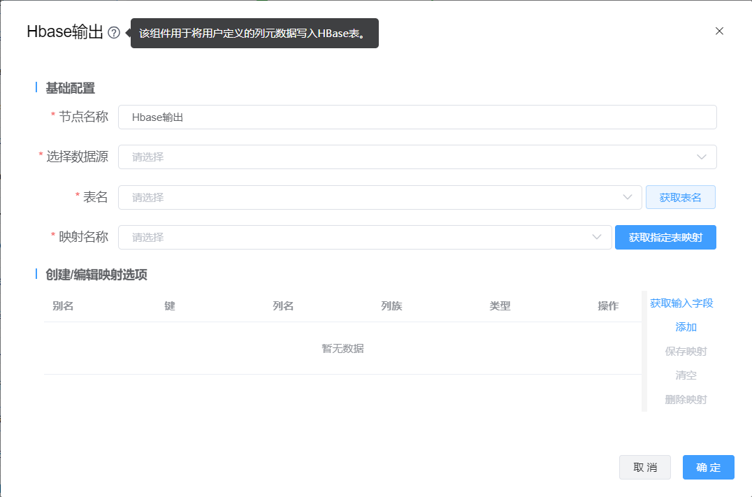 使用场景:该组件用于获取Hbase字段与输出流中字段映射,并结果写入Hbase表