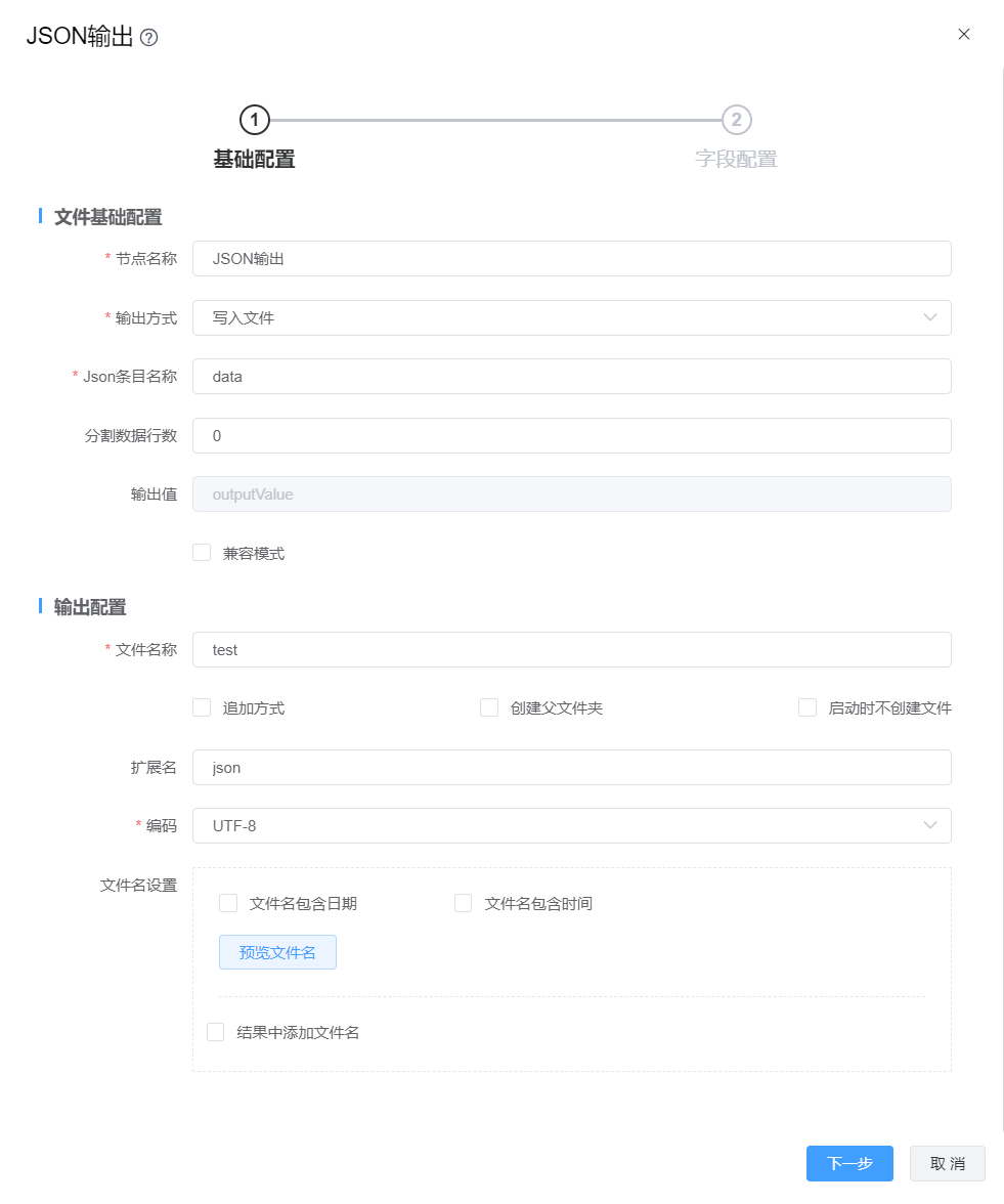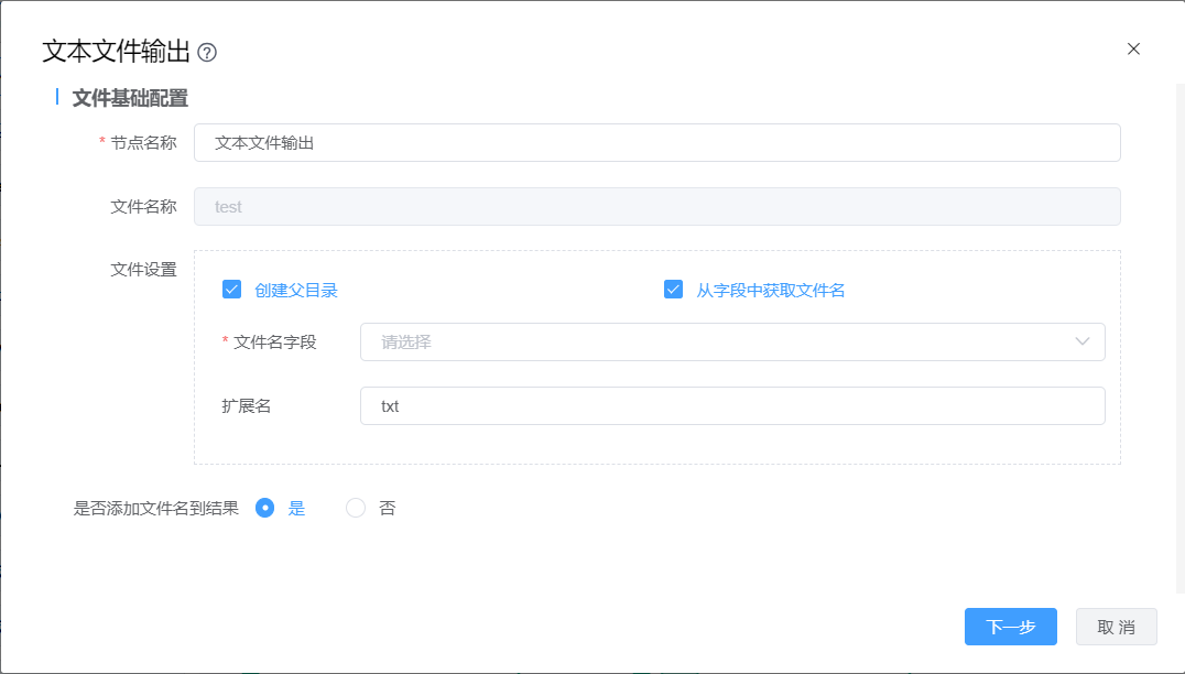 | 从字段中获取文件名:从前置步骤结果中获取字段作为文件名,下方将能够选择包含文件名字段 | |