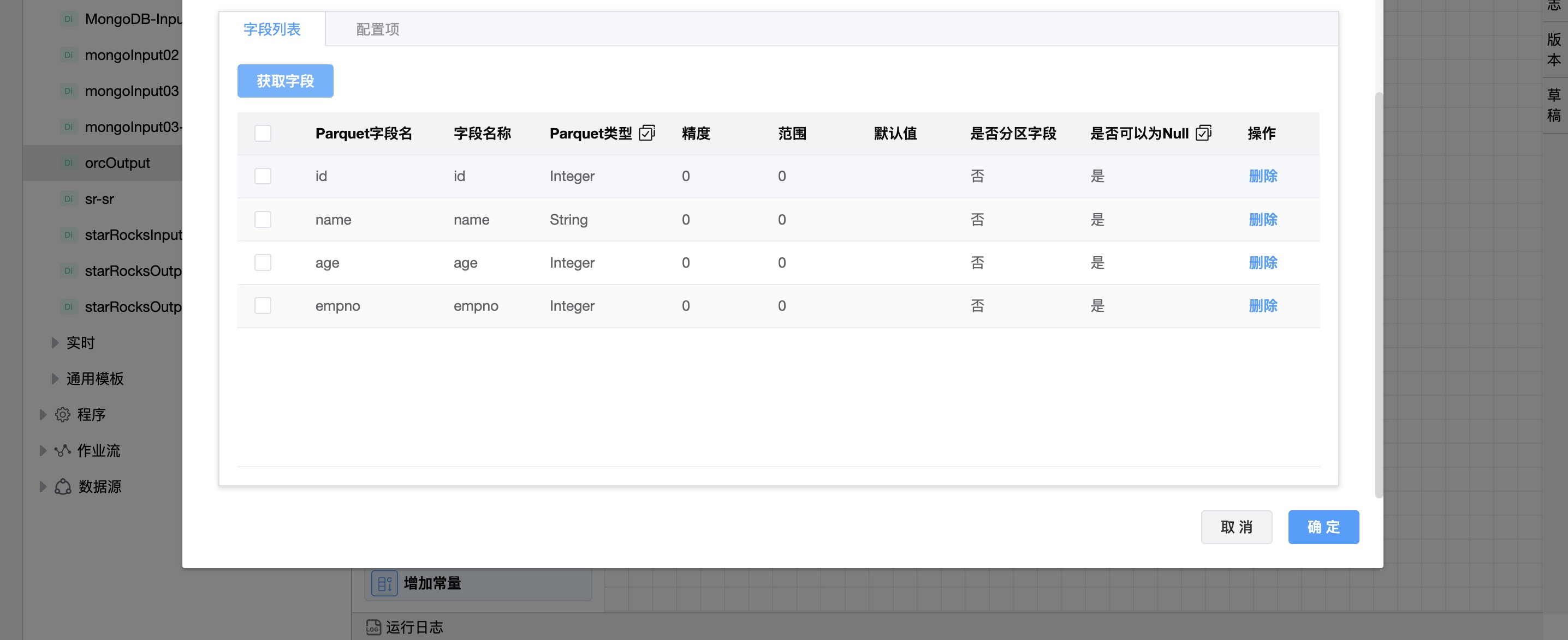 可以手动添加字段,也可以“获取字段”来填充字段。当检索字段时,PDI类型将转换为适当的Parquet类型。