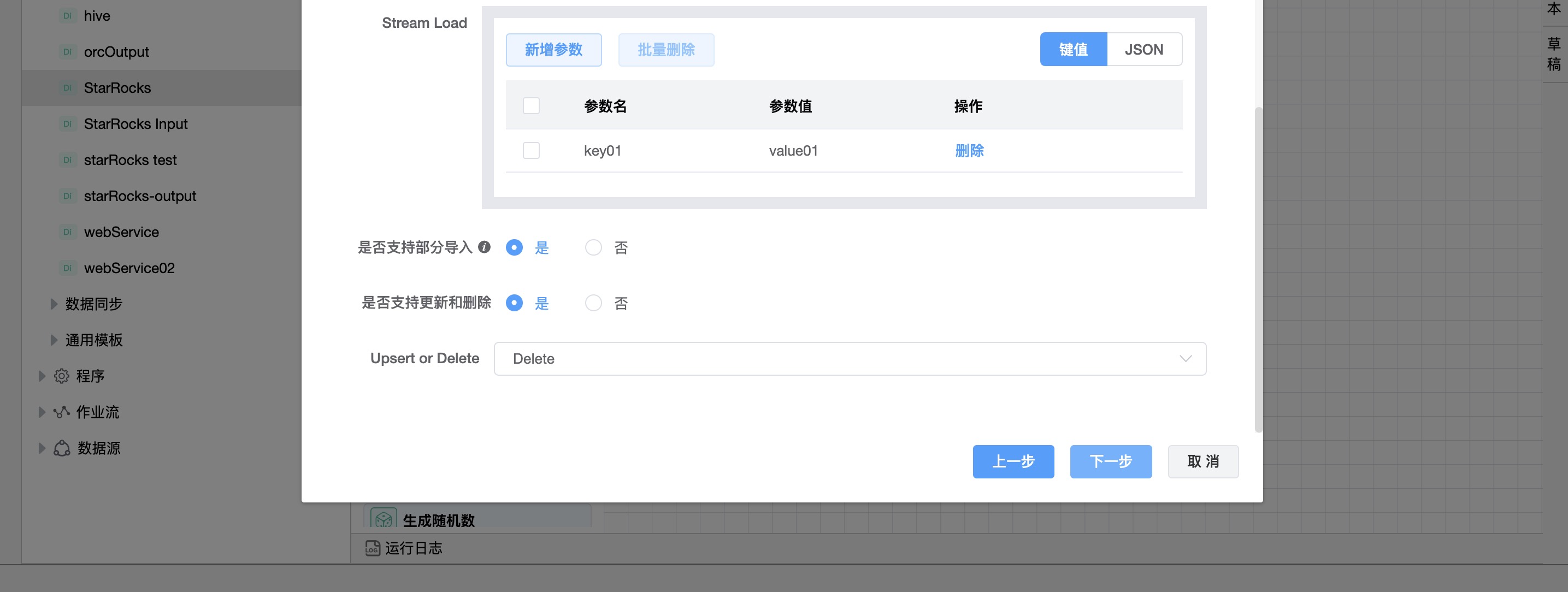 | 是否支持更新和删除 | 是否启用upsert/delete,只支持PrimaryKey模式。 |