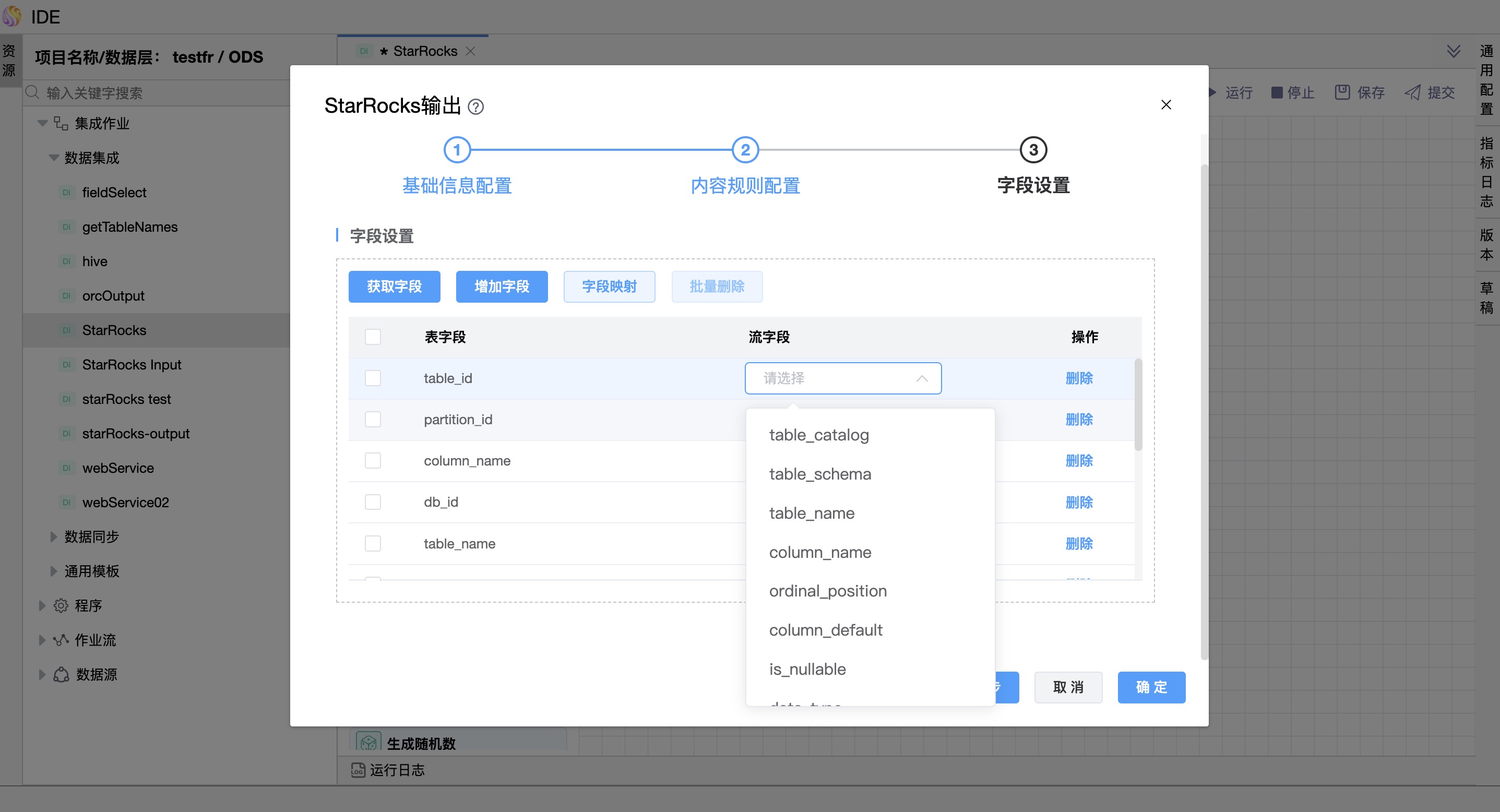 | 字段设置 | 表字段:根据选择的数据源及目标表,展示输出数据。 流字段: 根据上游的输入组件的输出字段,展示输入字段。 |