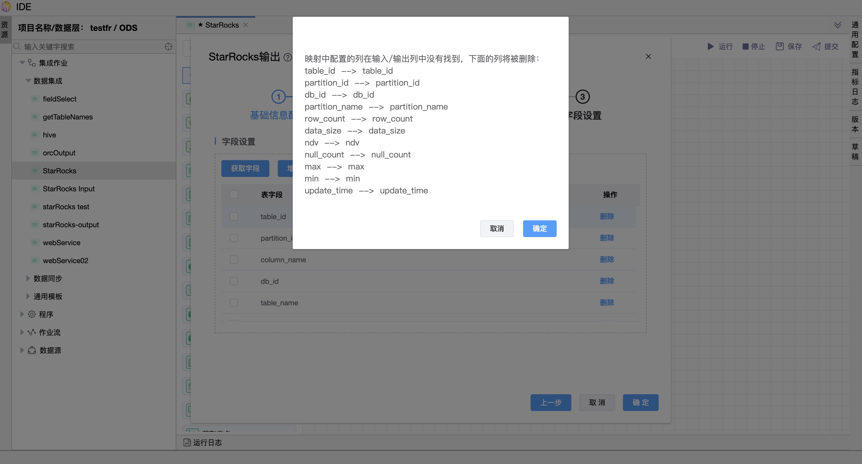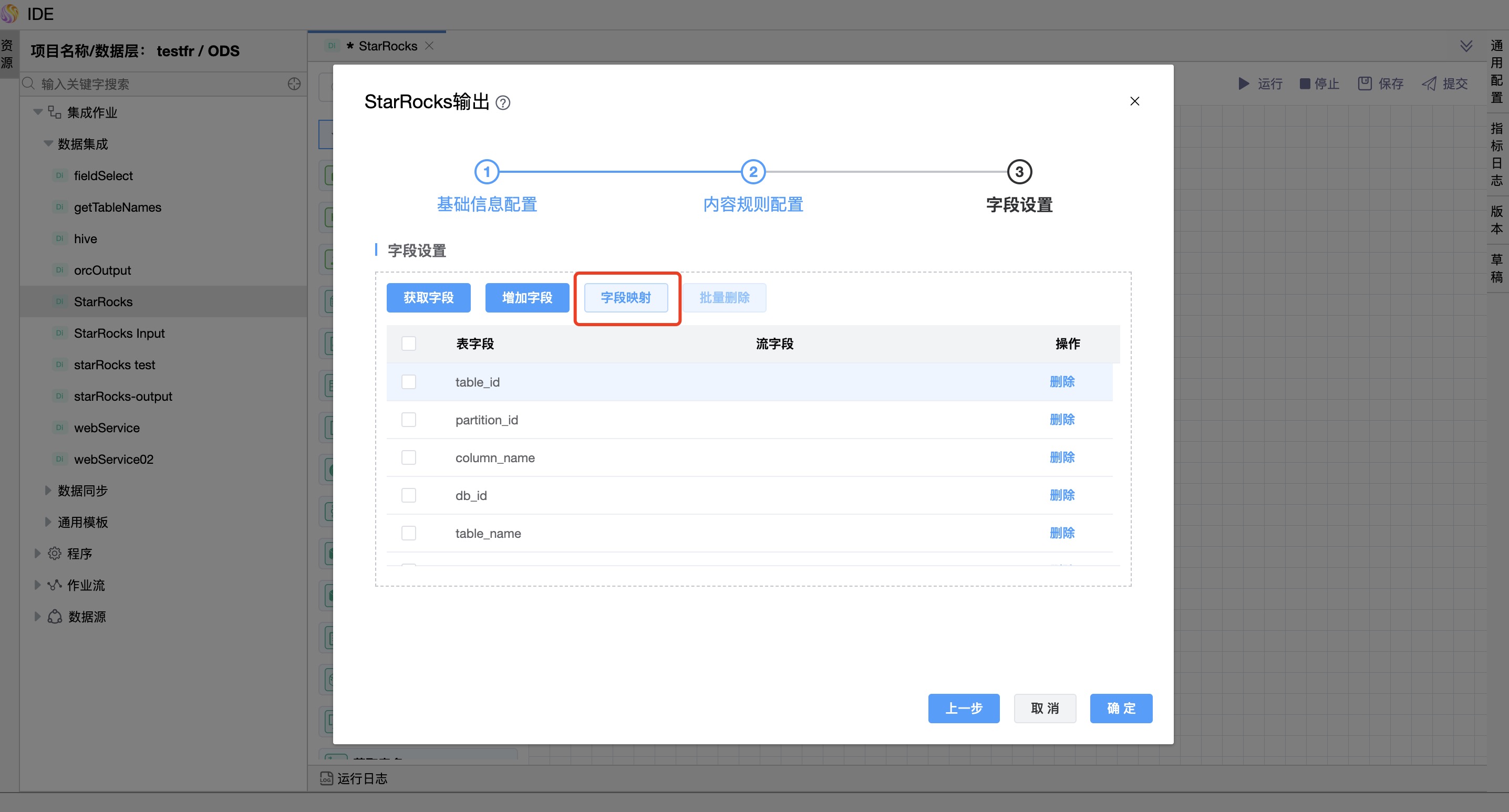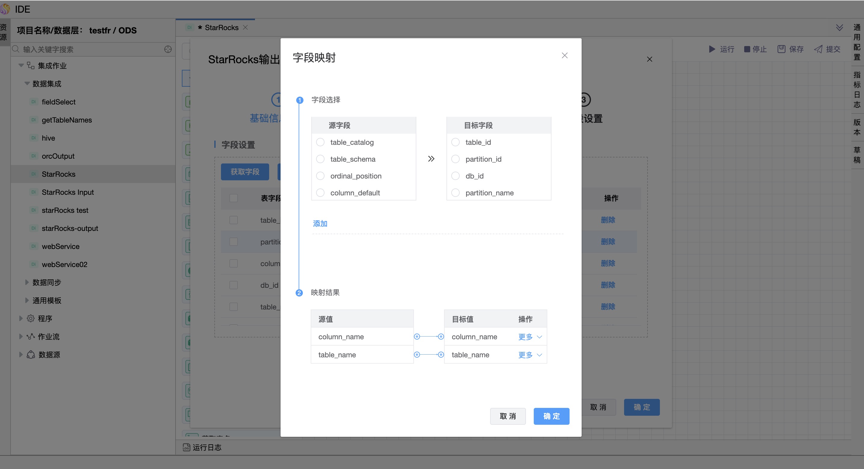 - 字段映射(通过在来自数据源目标表与来自上级节点的字段集中选择字段,来手动配置字段映射)
