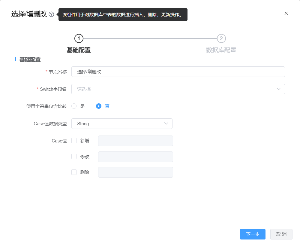 | Case值 | 新增:勾选此项,并填写响应的case值,switch值与case值比较为true时,进行新增操作 |