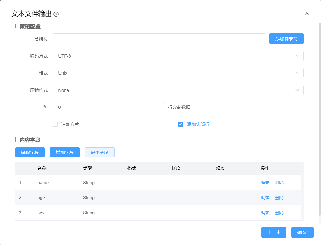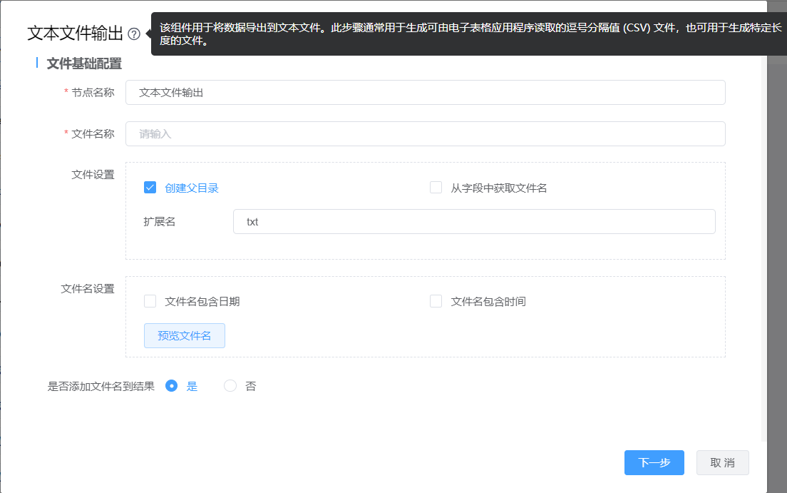 功能介绍:文本文件输出用于将数据导出到文本文件。此步骤通常用于生成可由电子表格应用程序读取的逗号分隔值 (CSV) 文件,也可用于生成特定长度的文件