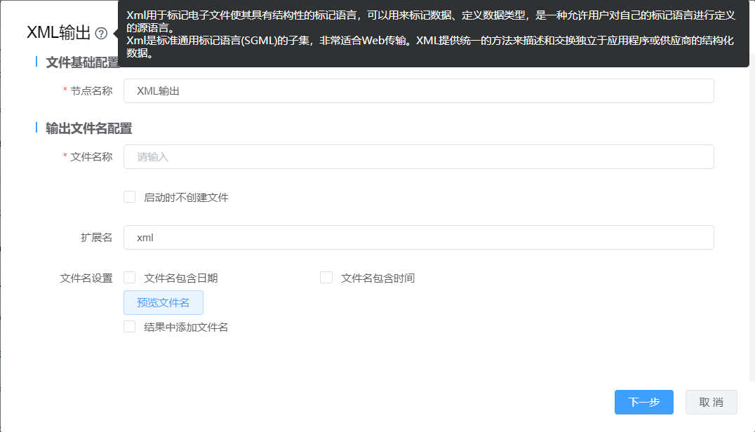 | 在接收数据前不创建文件 | 勾选此项,完成此步骤后,再创建输出文件。当数据流中没有行时,这可以避免创建空文件 |