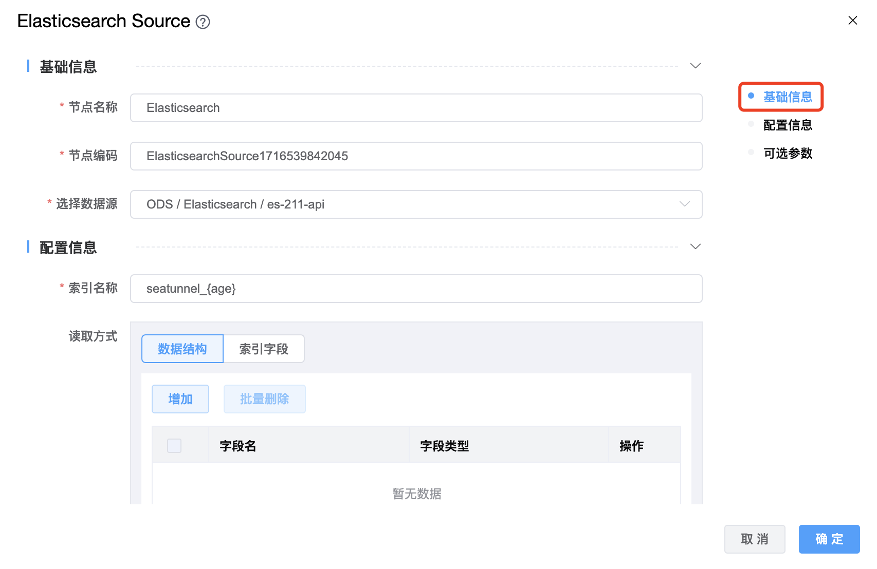 节点名称 当前创建的 Elasticsearch Source 节点名称,由用户自定义且不可为空。命名可包含汉字、字母、数字、下划线。