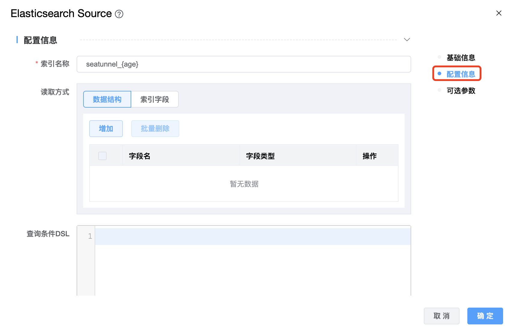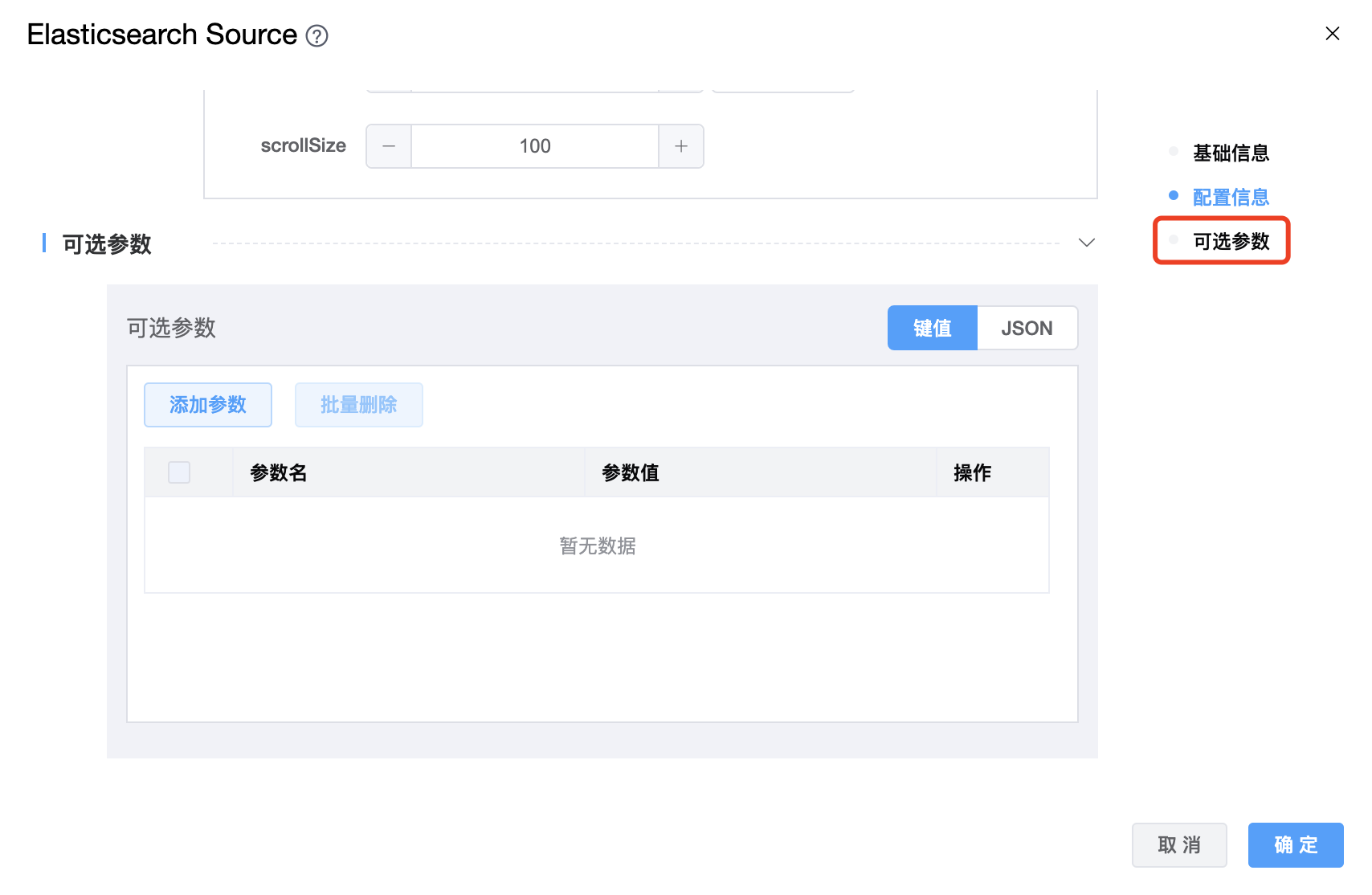 可选参数 Elasticsearch Source 的其他参数,用户可以根据需求进行配置。