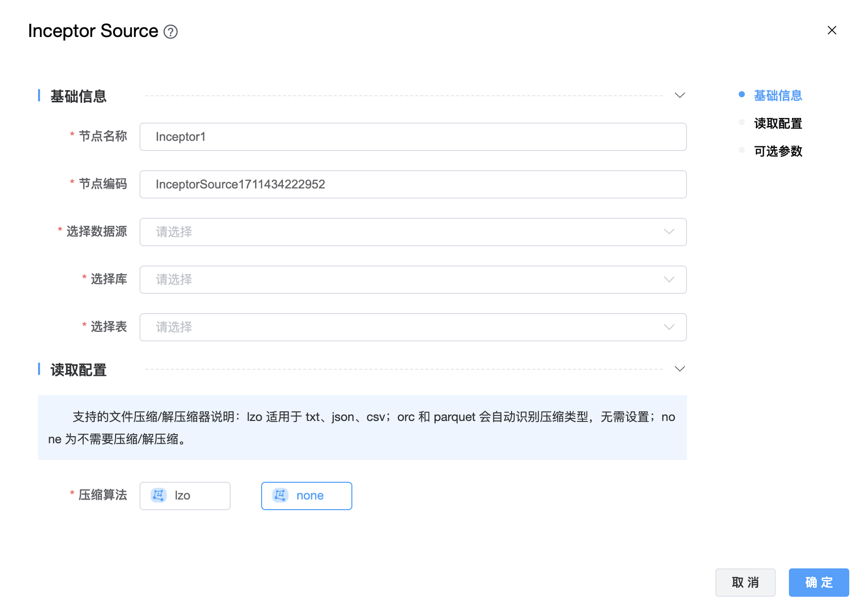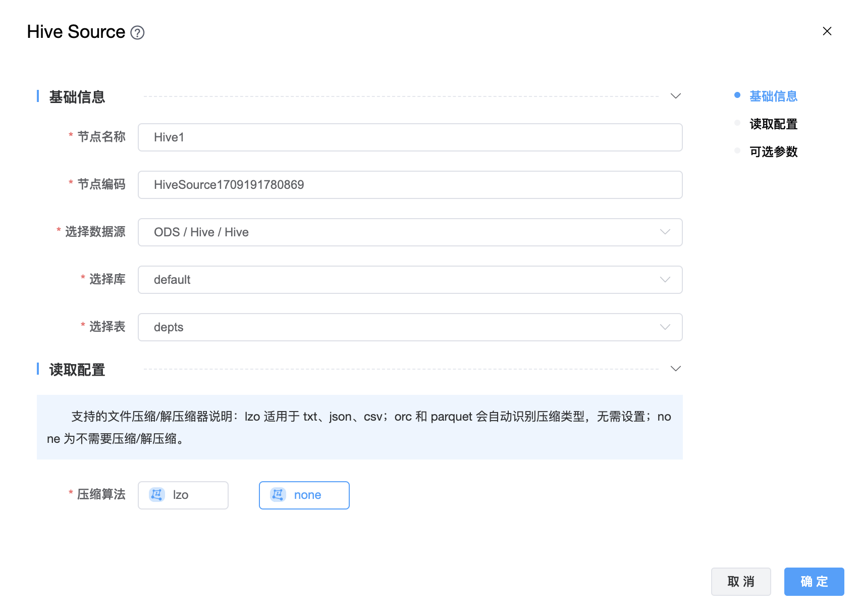 压缩算法 lzo 适用于 txt、json、csv;orc 和 parquet 会自动识别压缩类型,无需设置;none 为不需要压缩/解压缩。