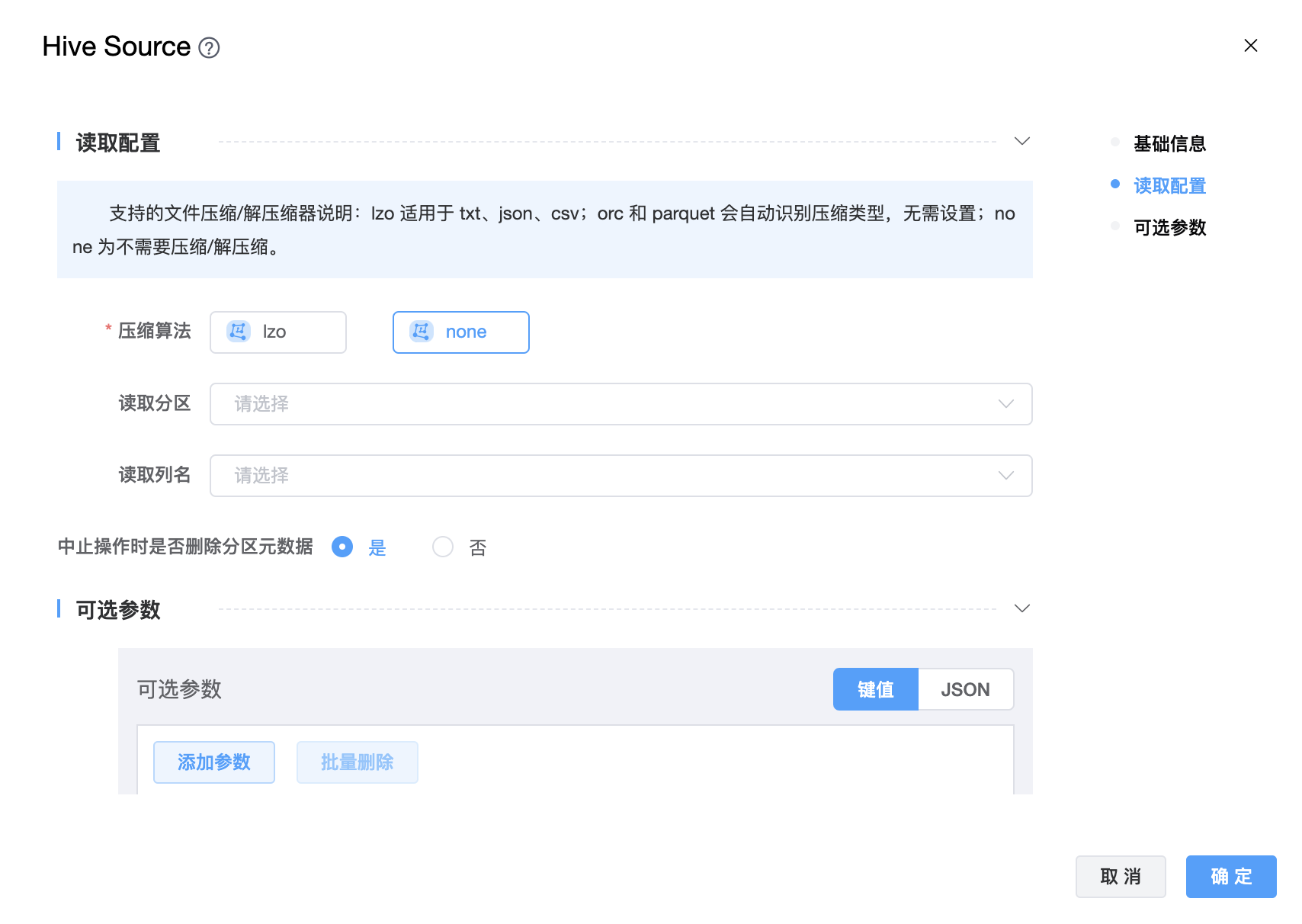 读取分区 从配置单元表中读取的目标分区,如果不设置此参数,将从配置单元中读取所有数据。