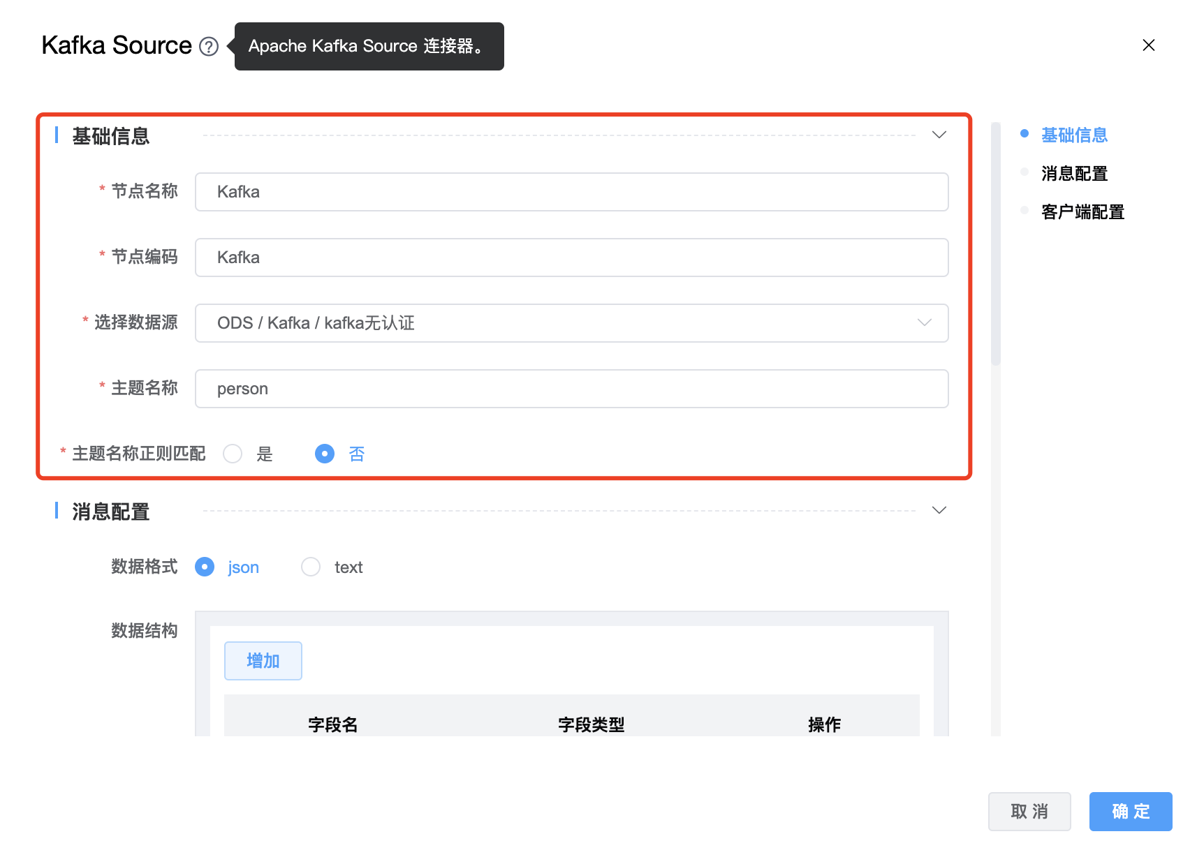 节点名称 当前创建的 Kafka Source 节点名称,由用户自定义且不可为空。命名可包含汉字、字母、数字、下划线。