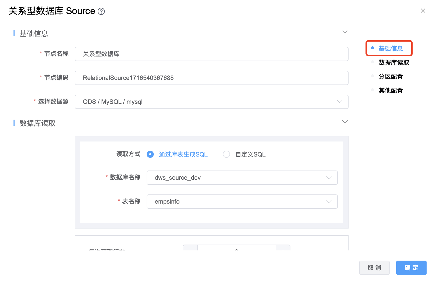 节点编码 当前创建的关系型数据库 Source 节点编码,由用户自定义且不可为空。命名可包含字母、数字、下划线。