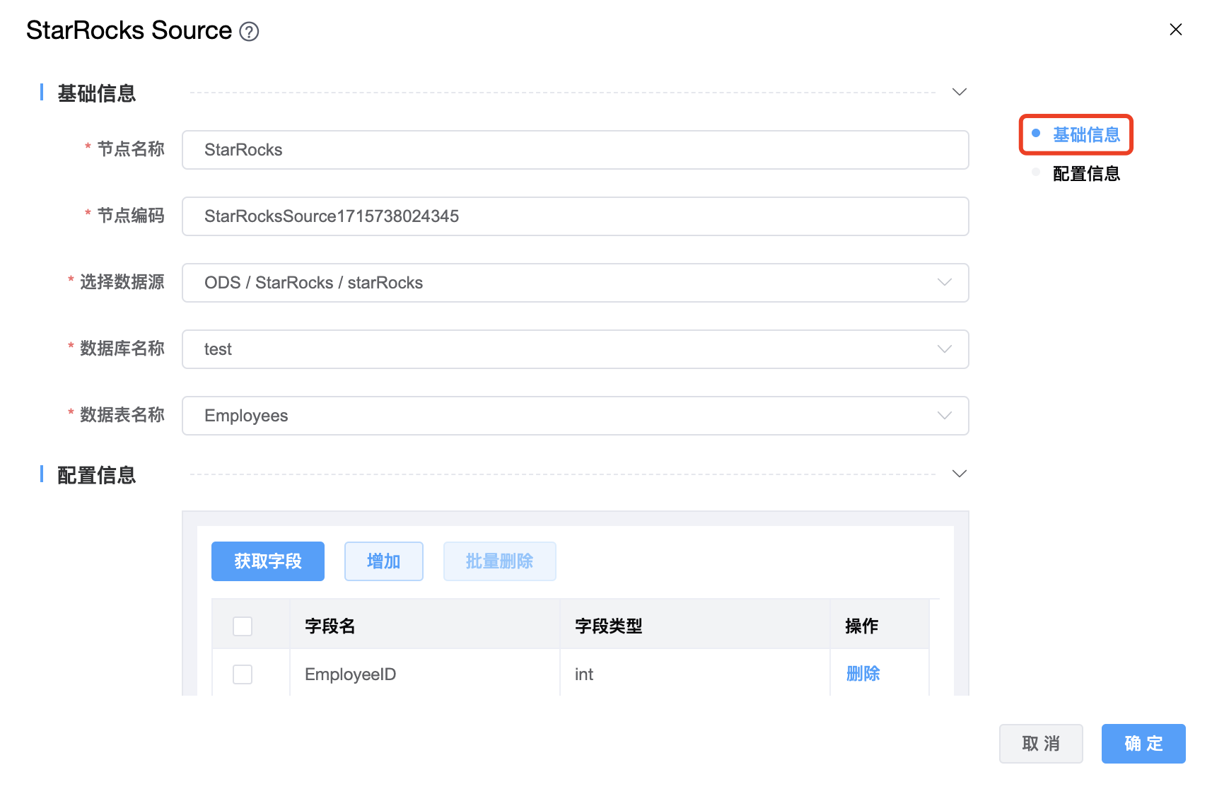 字段数据结构 要生成的 StarRocks 的字段数据结构,包括:字段名称和字段类型。