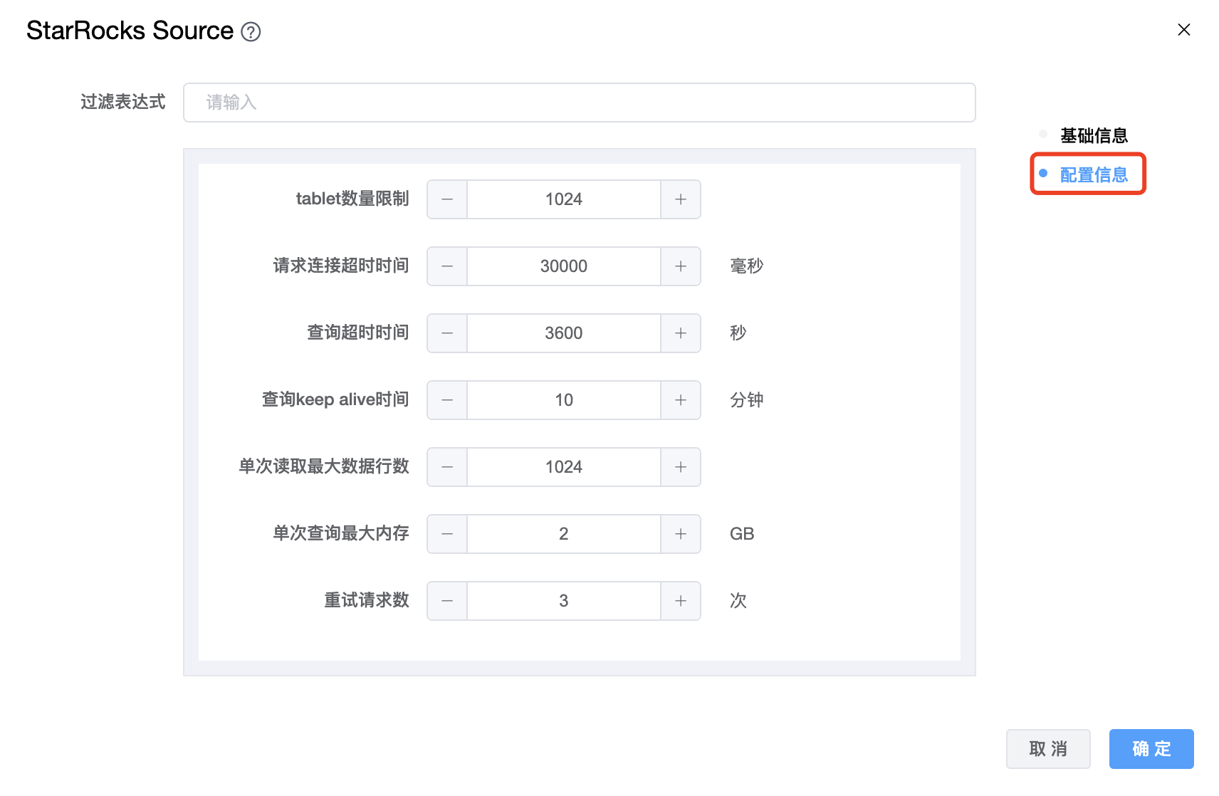过滤表达式 查询的过滤表达式,StarRocks 使用这个表达式来完成源端数据过滤。