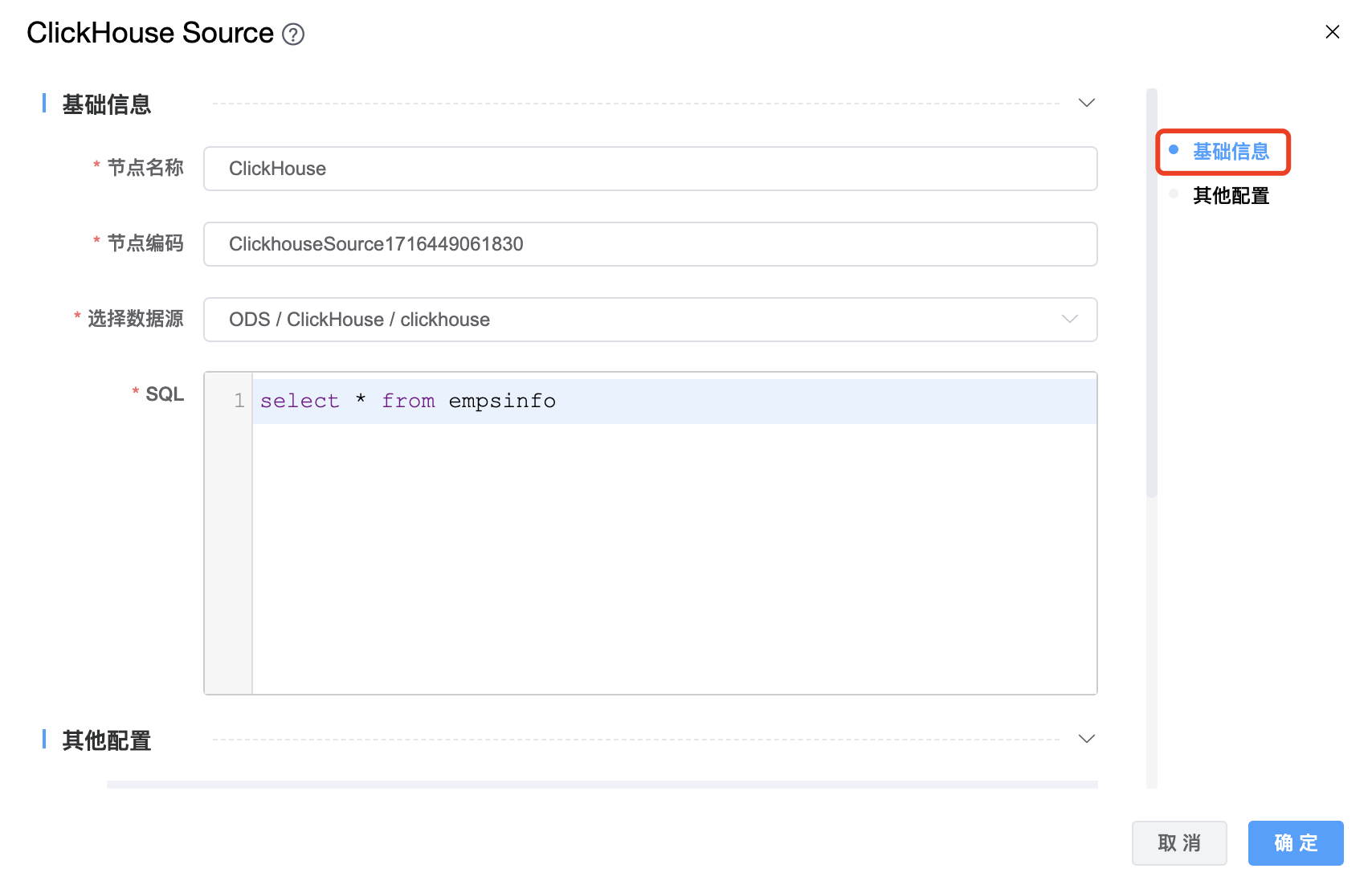 节点编码 当前创建的 ClickHouse Source 节点编码,由用户自定义且不可为空。命名可包含字母、数字、下划线。