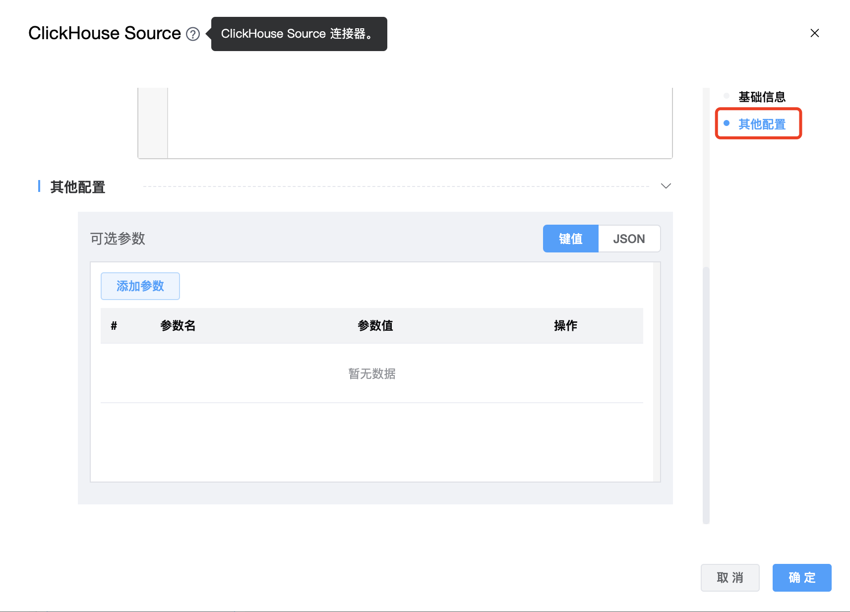 可选参数 ClickHouse Source 的其他参数,配置后即会启用该配置,不会再使用环境默认参数,用户可以根据需求进行配置。