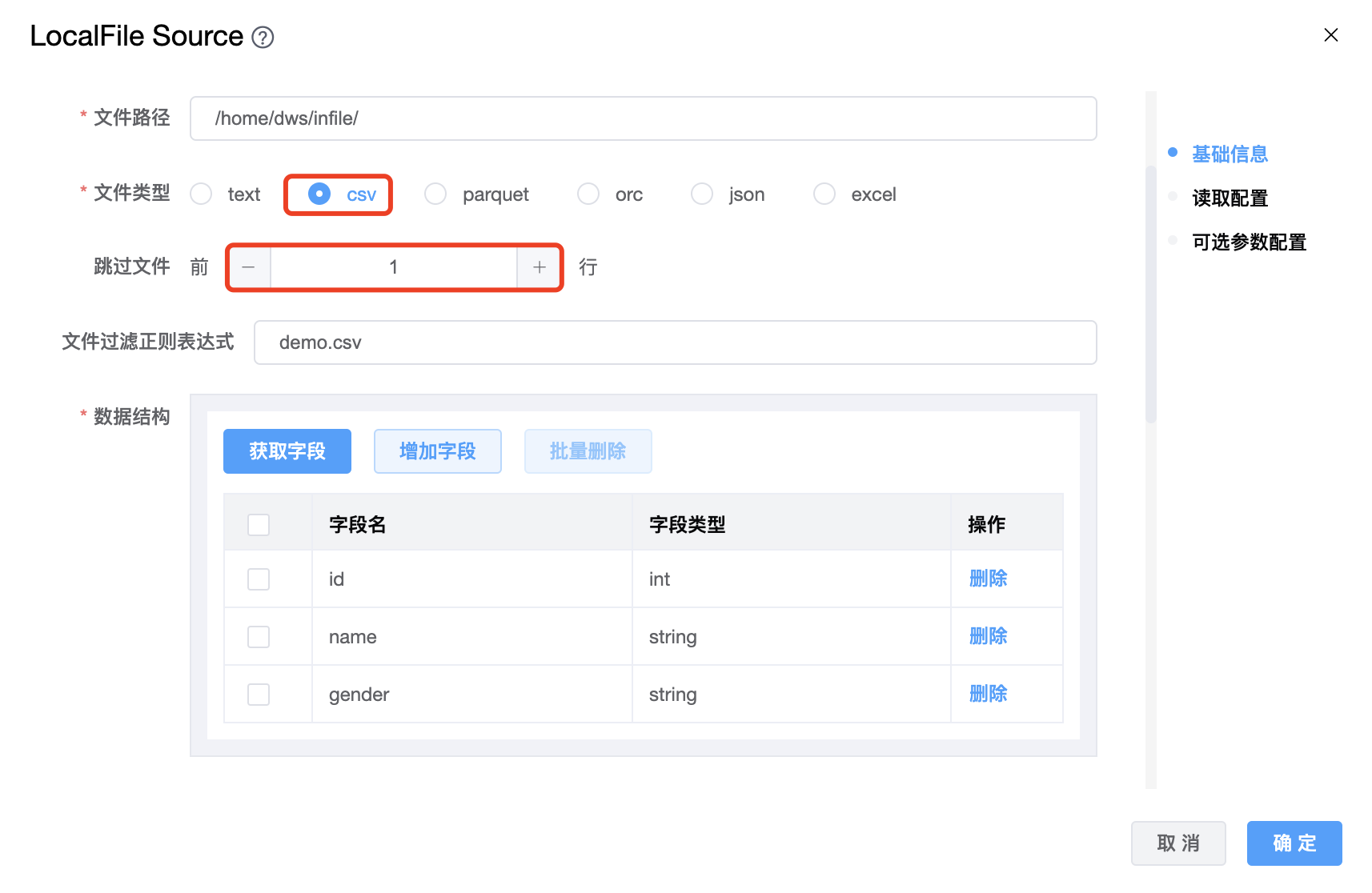 如果 csv 文件第一行是表头时,需要配置"跳过文件前的行数",需要跳过多少行就配置相应的行数。