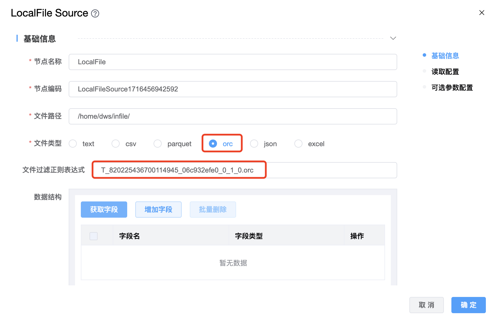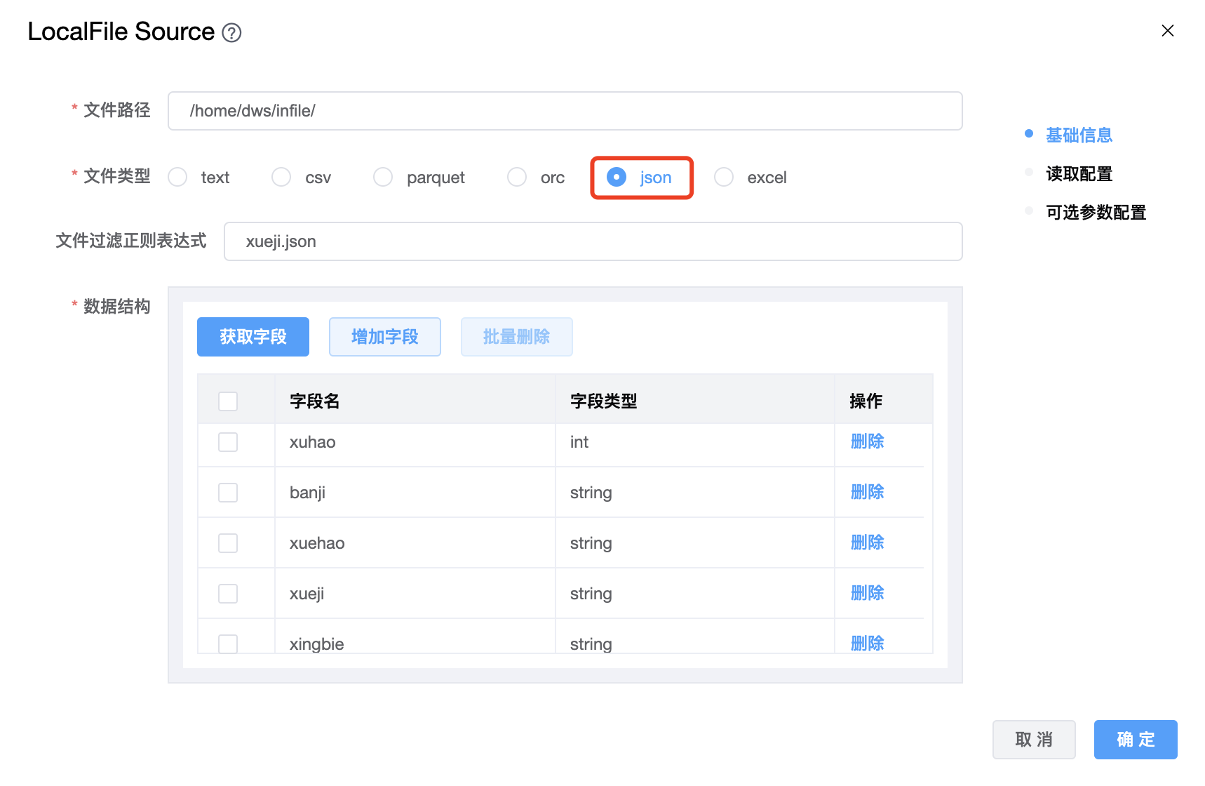 数据结构 字段的数据结构(包括字段名称和字段类型)。 支持的类型如下: