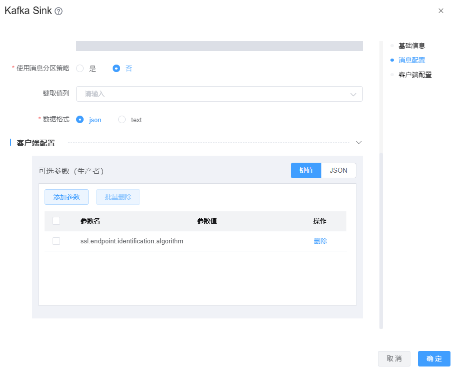 当kafka数据源使用的SSL认证时,Kafka Sink组件需要在【可选参数】中增加配置项:ssl.endpoint.identification.algorithm=,如下图