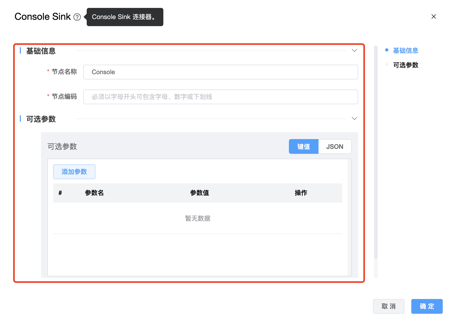 | 节点名称 | 当前创建的 Console Sink 节点名称,由用户自定义且不可为空。命名可包含汉字、字母、数字、下划线。 |