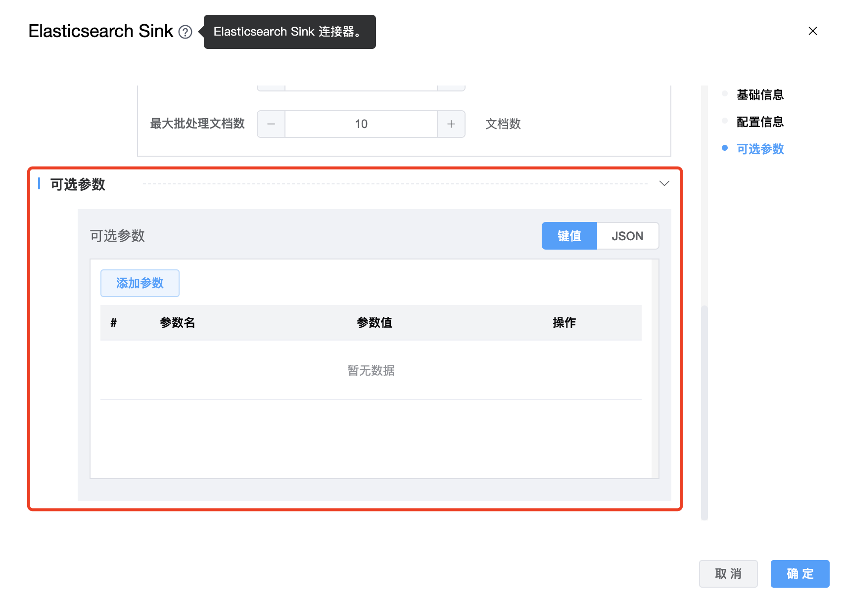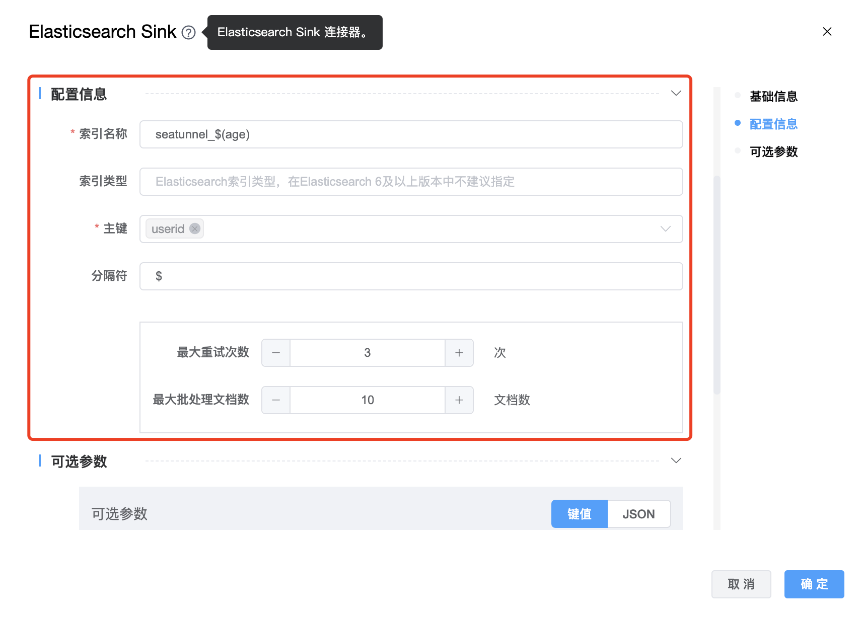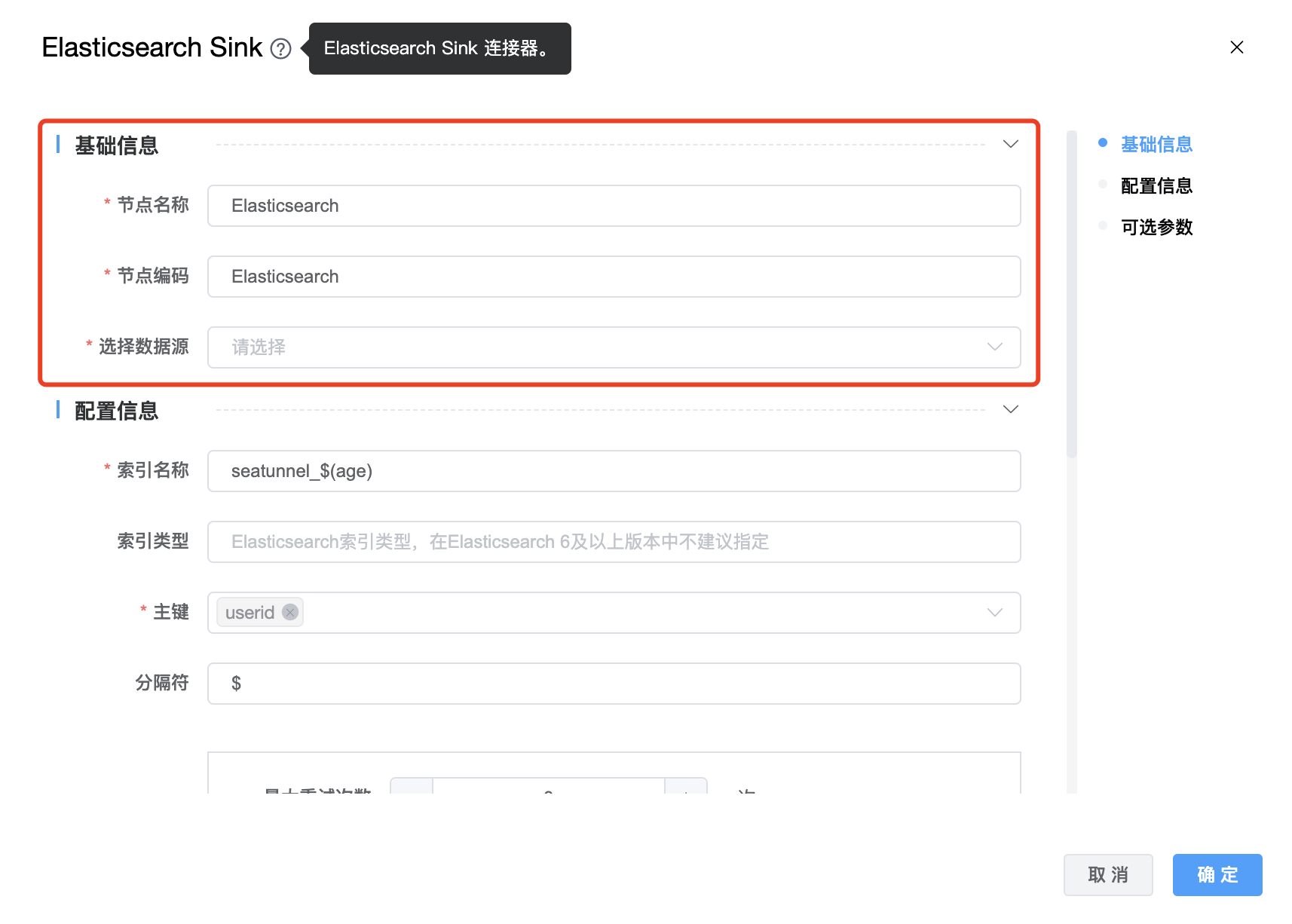| 节点编码 | 当前创建的 Elasticsearch Sink 节点编码,由用户自定义且不可为空。命名可包含字母、数字、下划线。 |