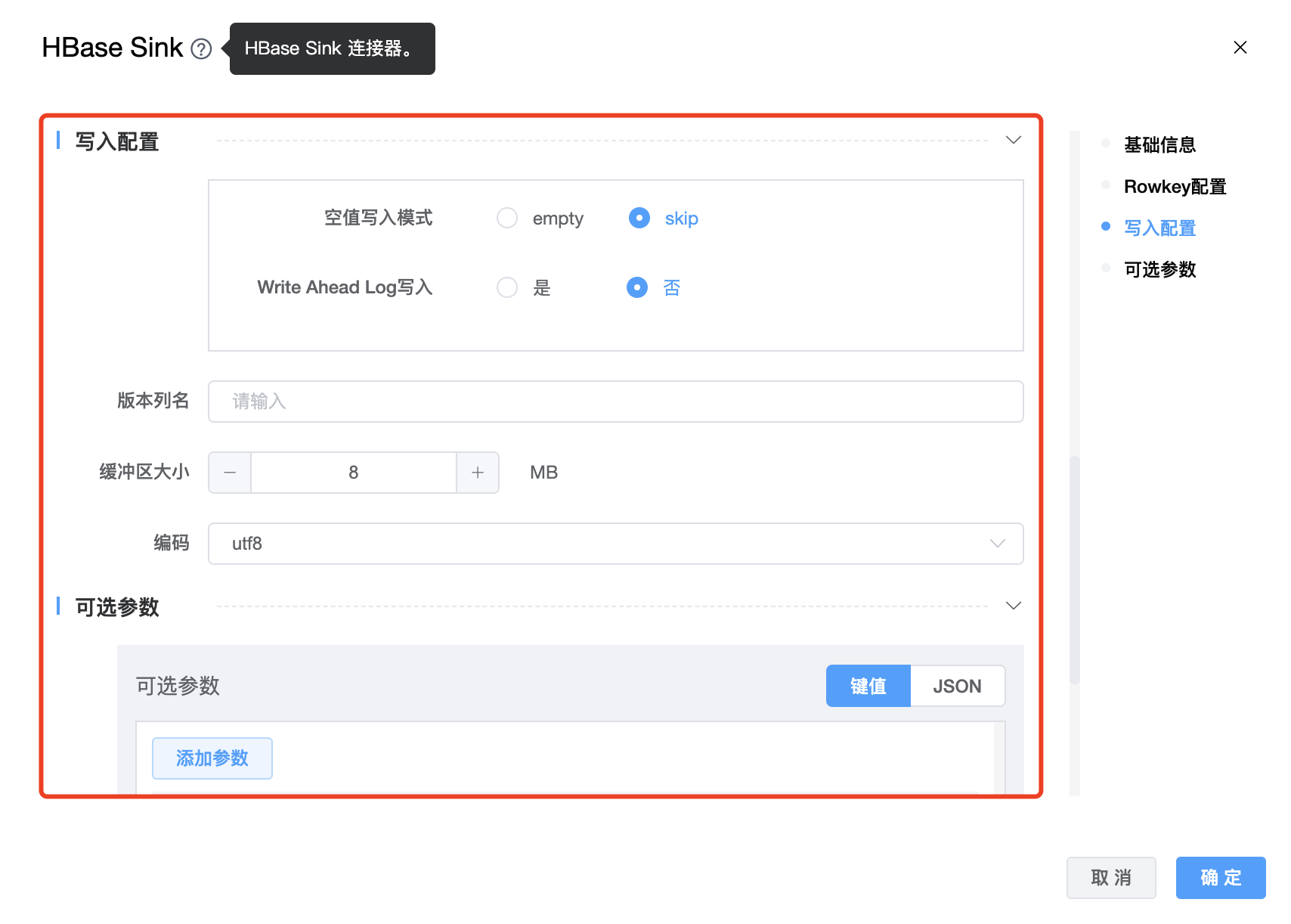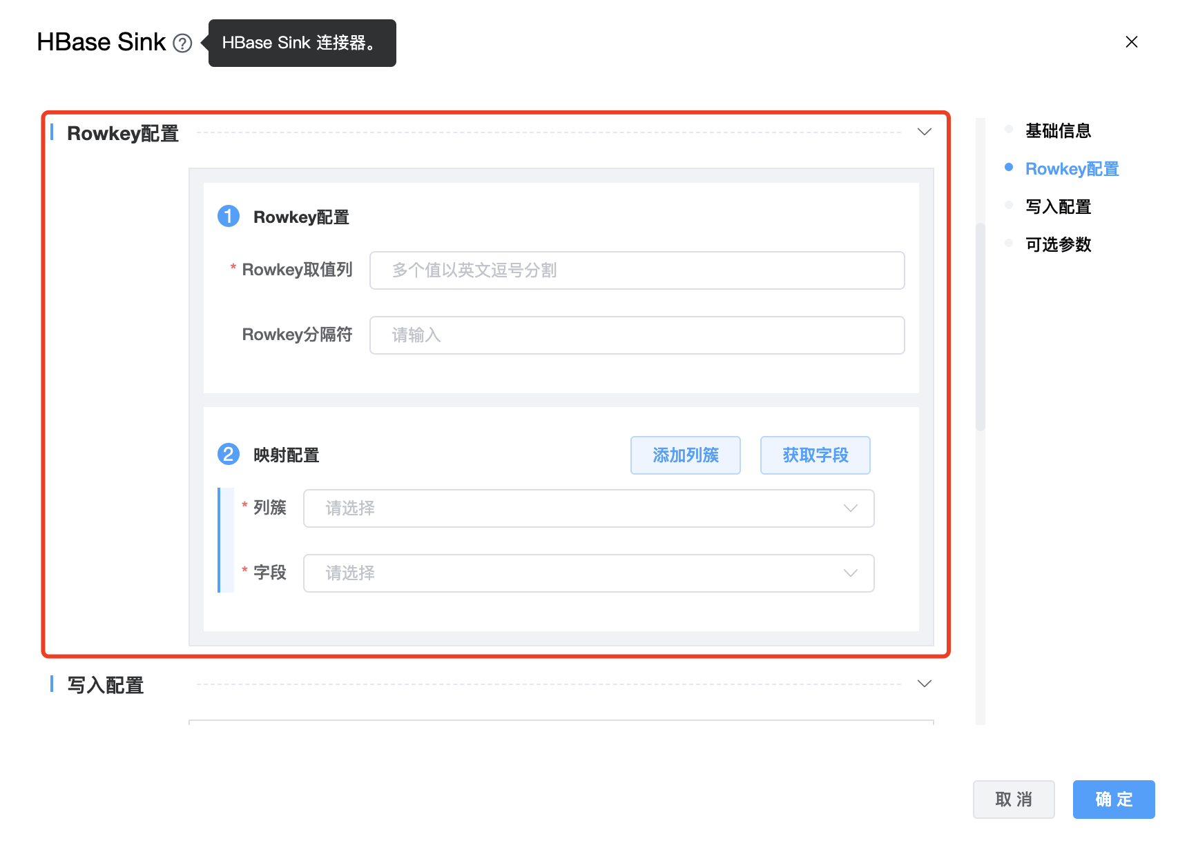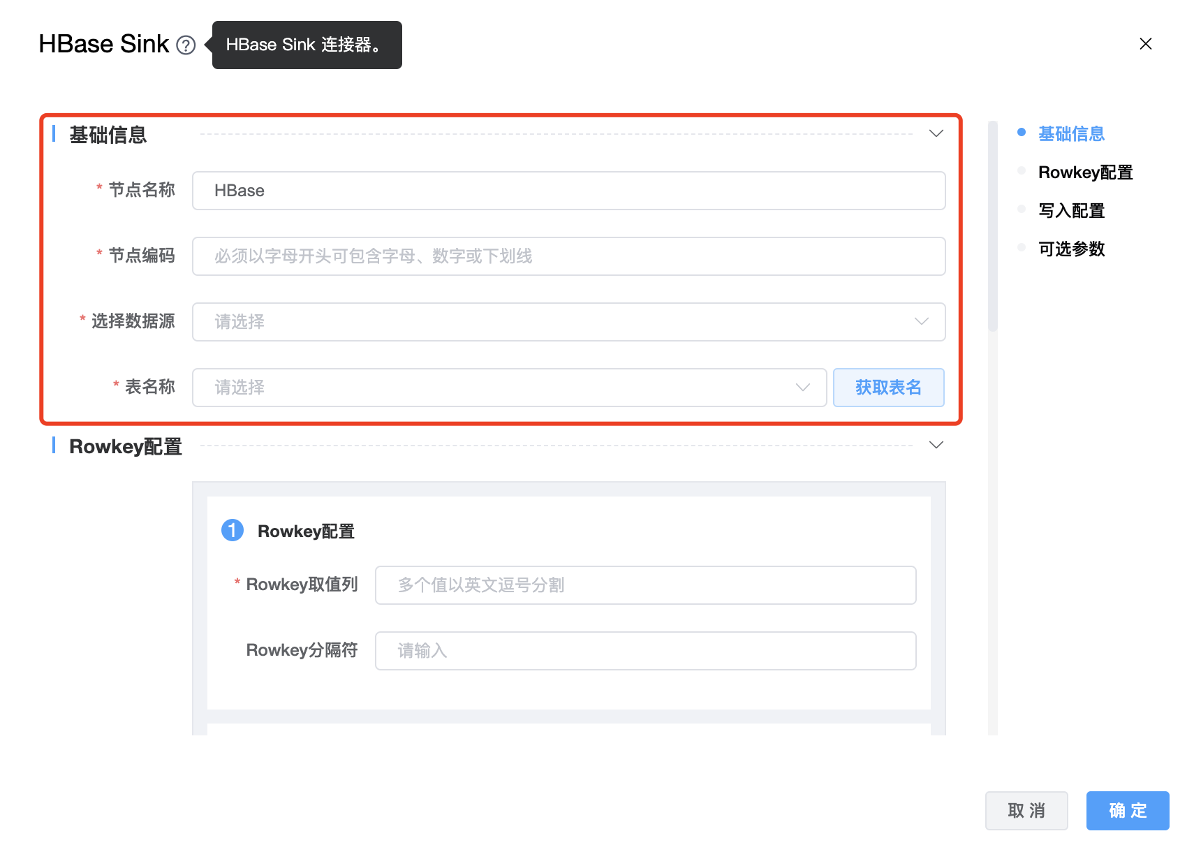 | 节点名称 | 当前创建的 HBase Sink 节点名称,由用户自定义且不可为空。命名可包含汉字、字母、数字、下划线。 |