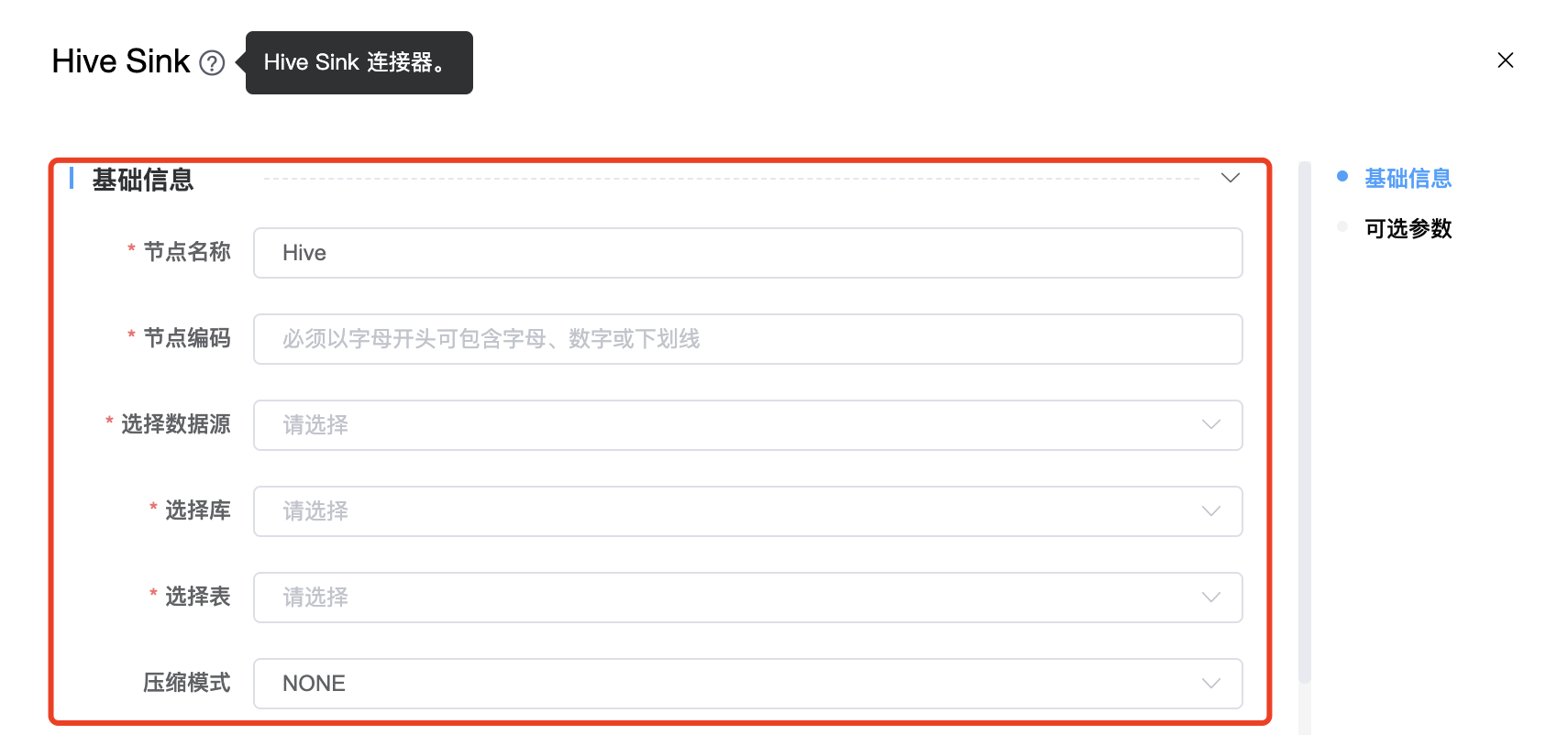| 节点编码 | 当前创建的 Hive Sink 节点编码,由用户自定义且不可为空。命名可包含字母、数字、下划线。 |
