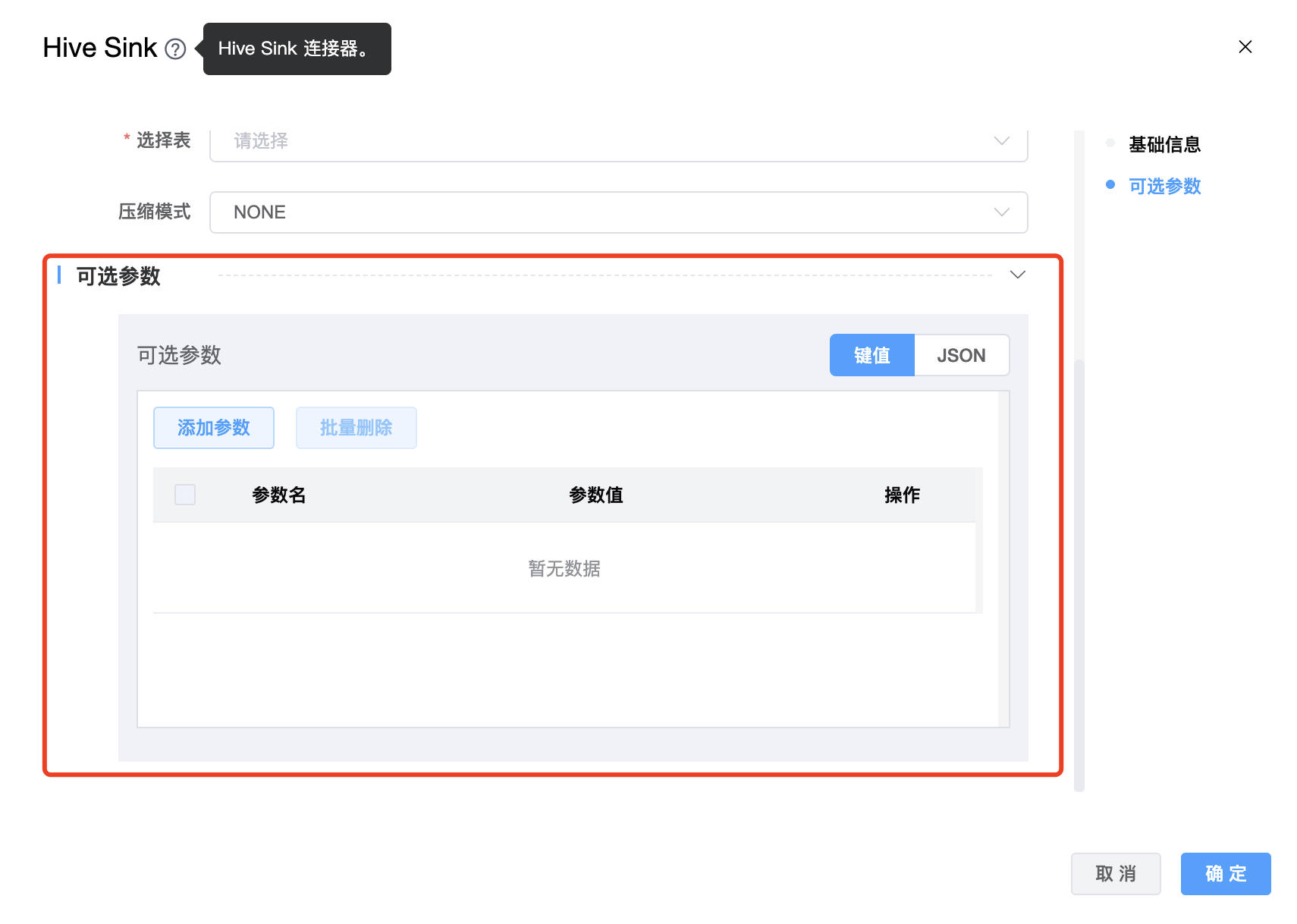 | 可选参数 | Hive Sink 的其他参数,用户可以根据需求进行配置。 |