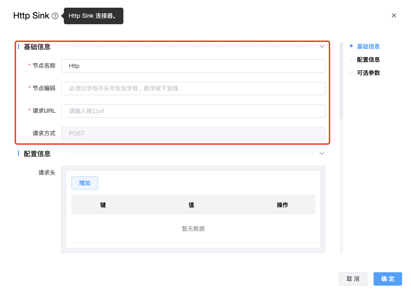 | 节点编码 | 当前创建的 Http Sink 节点编码,由用户自定义且不可为空。命名可包含字母、数字、下划线。 |