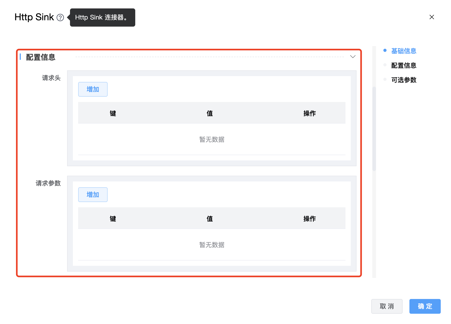 | 节点名称 | 当前创建的 Http Sink 节点名称,由用户自定义且不可为空。命名可包含汉字、字母、数字、下划线。 |