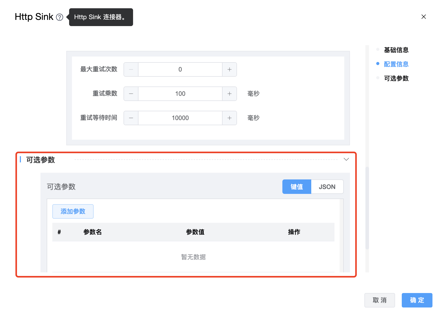 | 可选参数 | Http Sink 的其他参数,用户可以根据需求进行配置。 |