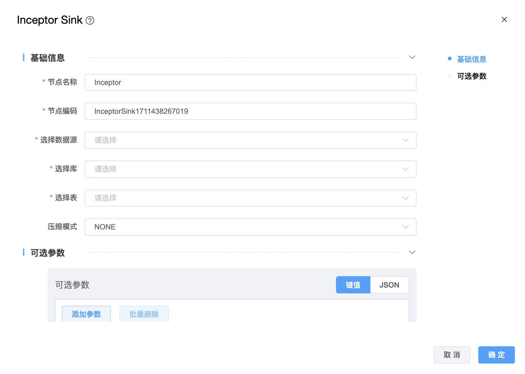 | 可选参数 | Inceptor Sink 的其他参数,用户可以根据需求进行配置。 |