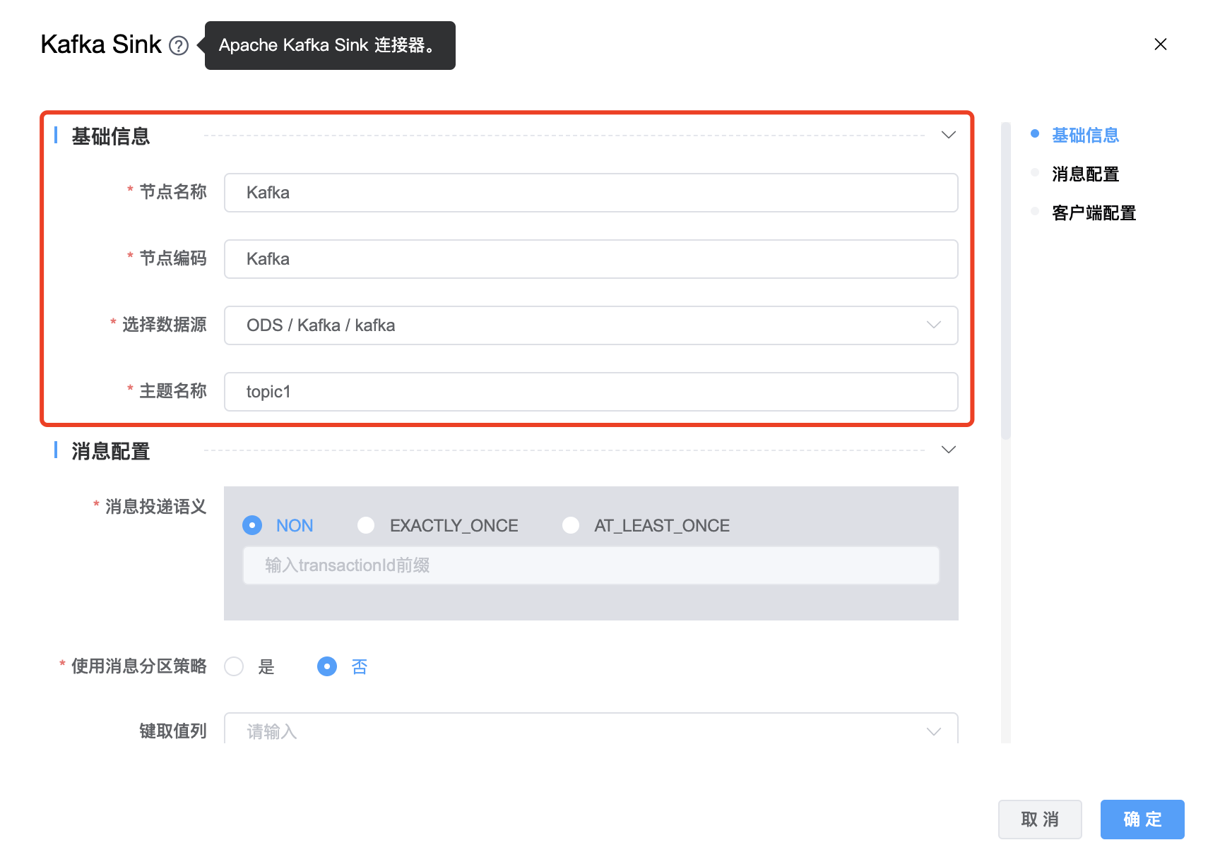 | 节点编码 | 当前创建的 Kafka Sink 节点编码,由用户自定义且不可为空。命名可包含字母、数字、下划线。 |